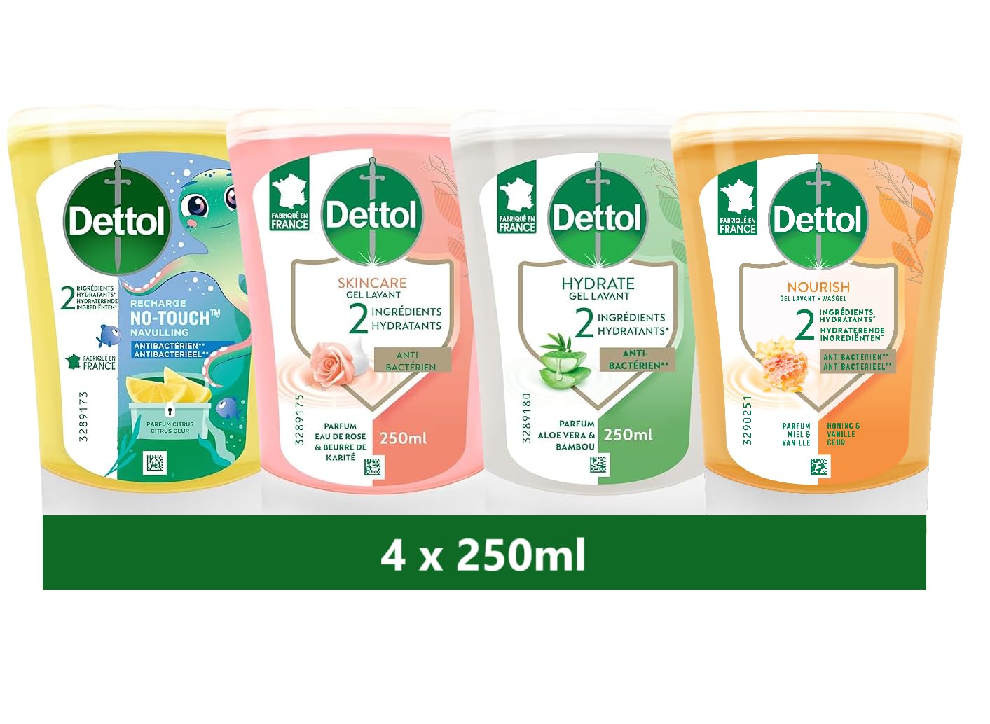 MADE IN France. PROTECTION - Our Dettol formula helps your family maintain healthy hands by effectively cleaning them. USE - The refills are used with the Dettol No-Touch dispenser for touchless handwashing. GENTLE - The hand wash has a formula that is gentle on the skin. It provides cleanliness and protection for the whole family. THIS PACK CONTAINS - 4 No-Touch Liquid Hand Wash Refills 250ml: 1 Honey Vanilla Scent Refill, 1 Lemon Scent Refill, 1 Rose Water Shea Butter Scent Refill, and 1 Aloe Vera Bamboo Scent Refill.