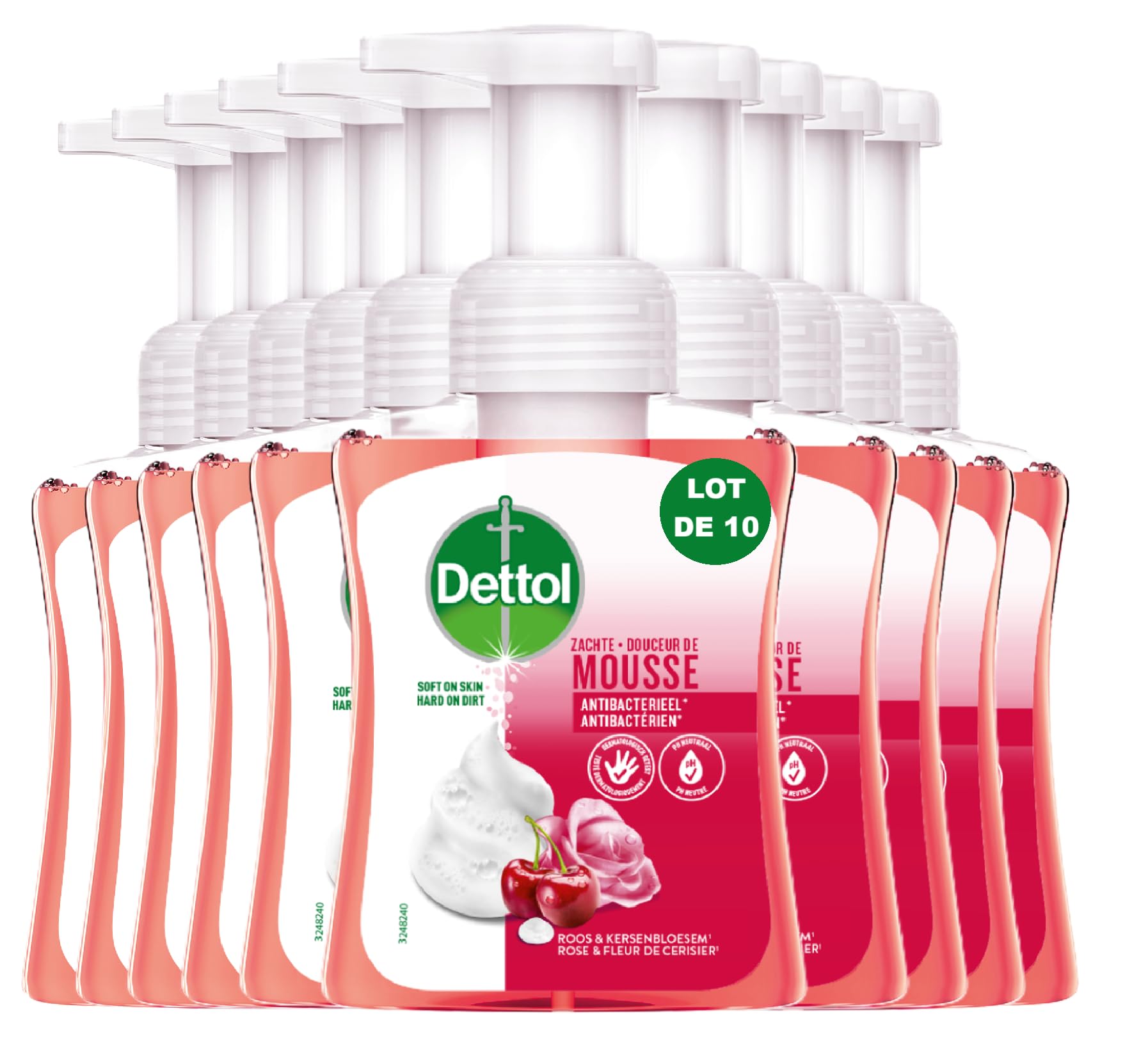 TESTÉ DERMATOLOGIQUEMENT - Sa formule a été testée dermatologiquement. PARFUM ROSE FLEUR DE CERISIER - La mousse lavante est également parfumée à la Rose Fleur de Cerisier et laissera sur la peau un parfum frais et agréable. PROPRETÉ ET DOUCEUR - Elle est adaptée à un usage quotidien pour des mains propres et douces. Sa texture en mousse très agréable à utiliser raviera toute la famille. MOUSSE LAVANTE - La formule de la mousse lavante Dettol Douceur de Mousse réagit au contact de la saleté pour l'éliminer et est enrichie en agents hydratants. CE LOT CONTIENT - 10 pousses mousses lavantes pour les mains à la Rose Fleur de Cerisier de 250ml.