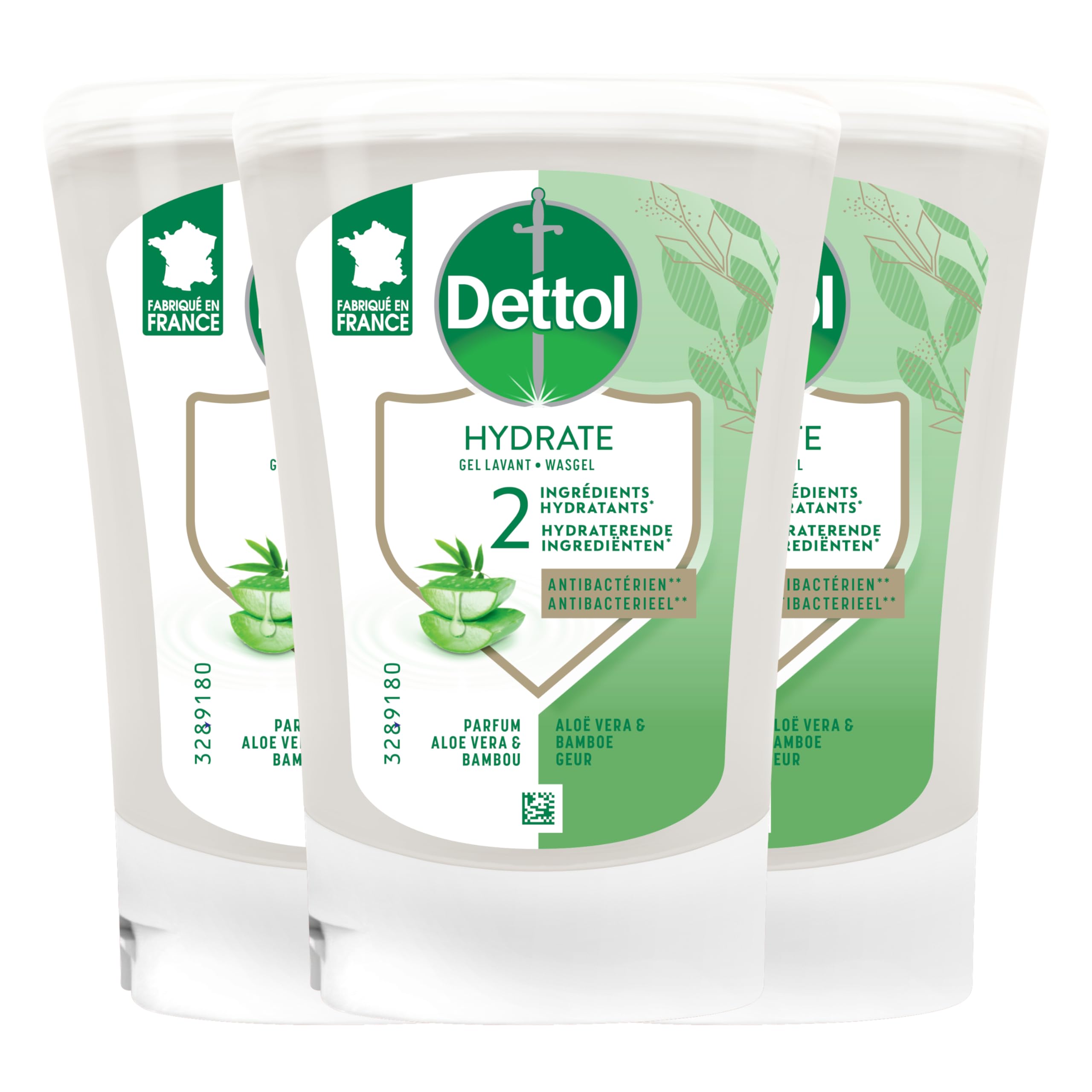 Precaution: For external use only. Keep out of reach of children. Avoid contact with eyes. In case of contact with eyes, rinse immediately and thoroughly with water. If irritation persists, contact a doctor. Store at room temperature INGREDIENTS Aloe vera SAFETY WARNING Precaution: For external use only. DERMATIOLOGICALLY TESTED - The No-Touch refill formula is dermatologically tested. ALOE VERA SCENT - The Dettol automatic dispenser soap refill has a pleasant Aloe Vera scent. USE - The refills are used with the Dettol No-Touch dispenser for contactless hand washing. GENTLE - The hand wash has a formula that reduces the presence of bacteria on the hands: gentle on the skin and protects against germs. It is a clean and protective treatment for the whole family. THIS PACK CONTAINS - 3 No-Touch Liquid Hand Soap Refills with Aloe Vera Scent of 250ml. Précaution d'emploi: Pour usage externe uniquement. Tenir hors de portée des enfants. Eviter le contact avec les yeux. En cas de contact avec les yeux, rincez immédiatement et abondamment à l'eau. Si une irritation persiste, contactez un médecin. Conservez à tempéraure ambiante INGRÉDIENTS Aloe vera AVERTISSEMENT DE SÛRETÉ Précaution d'emploi: Pour usage externe uniquement. TESTE DERMATIOLOGIQUEMENT - La formule des recharges No-Touch est testée dermatologiquement. PARFUM ALOE VERA - La recharge de savon pour distributeur automatique Dettol a une odeur agréable d'Aloe Vera. UTILISATION - Les recharges s'utilisent avec le distributeur No-Touch Dettol pour se laver les mains sans contact. DOUX - Le gel lavant a une formule qui réduit la présence des bactéries sur les mains : doux pour la peau et protège des germes, C'est un soin de propreté et de protection pour toute la famille. CE LOT CONTIENT - 3 Recharges No-Touch Savon Liquide pour les Mains Parfum Aloe Vera de 250ml.