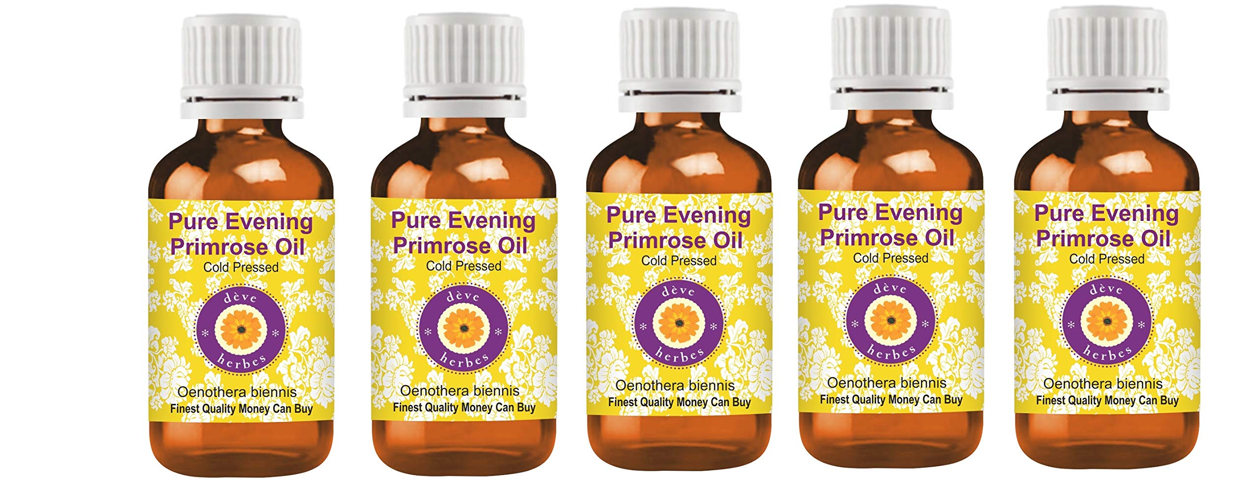 Deve Herbs Pure Evening Primrose Oil (Oenothera biennis) of natural, cold-pressed, therapeutic grade. We guarantee pure, natural, and undiluted oils of the highest quality. If you are not satisfied, you can receive a 100 refund even after using the product. Try it risk-free with our 100 money-back guarantee, no questions asked. About DEVE HERBS: Deve Herbs is a privately held essential oil company specializing in sourcing the finest natural essential oils from local regions around the world. With the world's largest range of essential oils and carrier oils, Deve Herbs has over one million highly satisfied customers in more than 100 countries. Our oils are natural, pure, undiluted, traceable, of the highest quality, and come with a 100 money-back guarantee. Our range also includes essential oil blends, aromatic oils, natural herbs, body butter, floral water, and waxes. Note: Store for at least 36 months from the packaging date printed on the box. Thank you for your purchase. INGREDIENTS Pure Evening Primrose Oil DIRECTIONS Cold-pressed carrier oils can be applied directly to the skin. It is derived from plant sources. Use it alone or with other oils to care for your skin. It can also be used to dilute essential oils for easier absorption. Caution: This product does not have child-resistant packaging. Keep out of reach of children. See moreUse: Carrier or cold-pressed oils can be applied directly to the skin. It is derived from plant sources. Use it alone or with other oils to care for your skin. It can also be used to dilute essential oils for easier absorption. Caution: This product does not have child-resistant packaging. Keep out of reach of children. Aroma: Carrier oils are not aromatic. Most natural carrier oils have little to no aroma. We do not add synthetic fragrances to make our oils smell pleasant. Pure Evening Primrose Oil is used for therapeutic purposes and has very little to no aroma. Use it to experience its therapeutic benefits. Quantity – 100 ml x 5 (16.9 oz) Container Type – High-quality amber glass bottle. Extraction Method: Cold-pressed botanical name – Oenothera Biennis. Pure, natural, undiluted, therapeutic-grade carrier oil. Alcohol-free, solvent-free, vegan, and cruelty-free. If you are unsatisfied for any reason, we will replace your product or refund your money. We believe our oils will provide you with lasting therapeutic benefits. We believe in our products and have offered a "no-questions-asked money-back guarantee" for 11 years. Superior quality that you can buy for your money. 100 satisfaction and purity guaranteed – We, the manufacturer Deve Herbs, guarantee that our oils are pure and natural. We offer a 100 satisfaction guarantee on our products.Deve Herbes Oenothera biennis Huile de primevère pure soirée - Qualité thérapeutique naturelle pressée à froid (Pack of Five) 100 ml x 5 (16,9 oz)DESCRIPTION DU PRODUIT DESCRIPTION DU PRODUIT Deve Herbes Huile de primevère pure du soir (Oenothera biennis) de qualité thérapeutique naturelle pressée à froid. Nous garantissons des huiles pures, naturelles et non diluées de la plus haute qualité. Wenn Sie nicht zufrieden sind, können Sie auch nach der Verwendung des Produkts eine 100 ige Rückerstattung erhalten. Testez sans risque avec la garantie de remboursement à 100 sans question. À propos de DEVE HERBES : dève herbes est une entreprise privée d'huiles essentielles qui se spécialise dans l'obtention des meilleures huiles essentielles naturelles provenant de régions locales du monde entier. Avec la plus grande gamme d'huiles essentielles et de support au monde, Dève herbes compte plus d'un million de clients très satisfaits dans plus de 100 pays. Nos huiles sont naturelles, pures, non diluées, d'origine traçable, de la plus haute qualité et avec une garantie de remboursement à 100 . Notre gamme comprend également des mélanges d'huiles essentielles, des huiles aromatiques, des herbes naturelles, du beurre corporel, de l'eau florale et des cires. Remarque : à conserver au moins 36 mois à compter de la date d'emballage indiquée sur l'emballage. Merci pour votre achat. INGRÉDIENTS Huile de primevère pure du soir MODE D'EMPLOI Les huiles de support pressées à froid peuvent être appliquées directement sur la peau. Il est obtenu à partir de sources végétales. Utilisez-le seul ou avec d'autres huiles pour prendre soin de votre peau. Il peut également être utilisé pour diluer les huiles essentielles pour les transporter dans la peau. Attention : ce produit n'a pas de sécurité enfant. Tenir hors de portée des enfants. Voir plusUtilisation : les huiles de support ou pressées à froid peuvent être appliquées directement sur la peau. Il est obtenu à partir de sources végétales. Utilisez-le seul ou avec d'autres huiles pour prendre soin de votre peau. Il peut également être utilisé pour diluer les huiles essentielles pour les transporter dans la peau. Attention : ce produit n'a pas de sécurité enfant. Tenir hors de portée des enfants. Aroma : les huiles de support ne sont pas aromatiques. La plupart des huiles de support naturelles ont un faible ou pas d'arôme. Nous n'ajoutons pas de parfums synthétiques pour que nos huiles sentent bien. L'huile de primevère pure du soir est utilisée à des fins thérapeutiques et a un très faible ou pas d'arôme. Utilisez-le pour profiter des bienfaits thérapeutiques. Quantité – 100 ml x 5 (16,9 oz) Type de récipient – Bouteille en verre ambré de haute qualité. Méthode d'extraction : nom botanique pressé à froid – Oenothera Biennis Huile de support pure, naturelle, non diluée de qualité thérapeutique, sans alcool, sans solvant, végétalien, sans cruauté animale. Wenn Sie aus irgendeinem Grund unzufrieden sind, werden wir Ihr Produkt ersetzen oder Ihr Geld zurückerstatten. Nous pensons que nos huiles vous apporteront des bienfaits thérapeutiques durables. Nous croyons en nos produits et offrons depuis 11 
