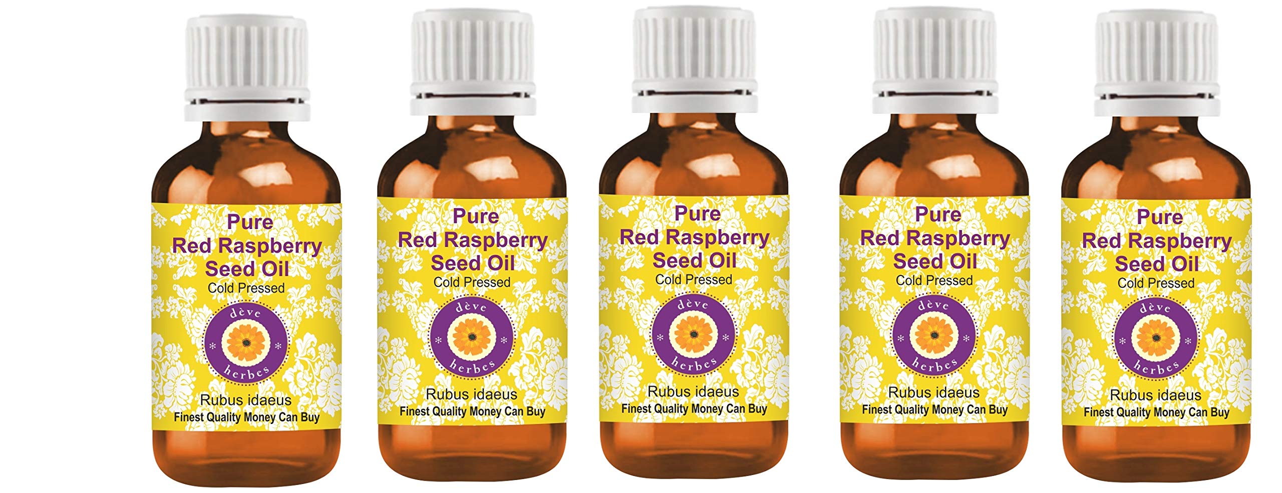 SATISFACTION AND PURITY - We, the manufacturer, Deve Herbs, guarantee that our oils are pure and natural. If you are not satisfied for any reason, we will replace your product or refund your money. We believe our oils will provide you with lasting therapeutic benefits. We believe in our products and have offered a no-questions-asked money-back guarantee for 13 years. For application to skin and hair - Cold-pressed oils or carrier oils can be applied directly to the skin. It is derived from plant sources. Use it alone or with other oils to nourish your skin. It can also be used to dilute essential oils to help them penetrate the skin. AROMA: Carrier oils are NOT aromatic oils. Most natural carrier oils have a LOW OR NO AROMA. We do not add synthetic aromas to make our oils appealing, unlike many other brands. Red raspberry seed oil is used for therapeutic purposes and has a very low or no aroma. Features - Pure, natural, undiluted, therapeutic grade, alcohol-free, solvent-free, cruelty-free, paraben-free, single-ingredient, additive-free, preservative-free, unscented, vegan, suitable for all skin types. Additional Uses - Carrier oils are widely used in beauty products for hydration, nourishment, and aromatherapy. Quantity - 100ml x 5 (16.9 oz), Container Type - High-quality amber glass bottle designed to preserve potency. Extraction Method - Cold-pressed, Botanical Name - Rubus idaeus, Daily Skincare Regimen, Lightweight, Non-greasy, Non-sticky, For all seasons.SATISFACTION ET PURETÉ - Nous, le fabricant, Deve Herbes, proposons que nos huiles soient pures et naturelles. Si vous n'êtes pas satisfait pour une raison quelconque, nous remplacerons votre produit ou vous rembourserons le montant. Nous pensons que nos huiles vous apporteront des bienfaits thérapeutiques durables. Nous croyons en nos produits et proposons un remboursement sans poser de questions depuis 13 ans. Pour l'application sur la peau et les cheveux - Les huiles pressées à froid ou les huiles de support peuvent être appliquées directement sur la peau. Il est dérivé de sources végétales. Utilisez-le seul ou avec d'autres huiles pour nourrir votre peau. Il peut également être utilisé pour diluer les huiles essentielles afin de les faire pénétrer dans la peau. ARÔME : Les huiles de support ne sont PAS des huiles aromatiques. La plupart des huiles de support naturelles ont un ARÔME FAIBLE OU AUCUN. Nous n'ajoutons pas d'arôme synthétique pour rendre nos huiles attrayantes, contrairement à de nombreuses autres marques. Graine de framboise rouge huile est utilisée à des fins thérapeutiques et a un arôme très faible ou nul. Caractéristiques - Pure, naturelle, non diluée, de qualité thérapeutique, sans alcool, sans solvant, sans cruauté, sans paraben, ingrédient unique, sans additifs, sans conservateurs, non désodorisée, végétalienne, convient à tous les types de peau. Utilisation supplémentaire - Les huiles de support sont largement utilisées dans les produits de beauté pour l'hydratation, la nutrition et l'aromathérapie. Quantité - 100ml X 5 (16,9 oz), Type de contenant - Bouteille en verre ambré de haute qualité conçue pour préserver la puissance. Méthode d'extraction - Pressée à froid, Nom botanique -Rubus idaeus, Régime de soins quotidiens de la peau, Léger, Non gras, Non collant, Pour toutes les saisons.Deve Herbes Pure Huile de Graine de framboise rouge (Rubus idaeus) Pressé à Froid qualité thérapeutique naturelle (Paquet de Cinq) 100ml X 5 (16,9 oz)