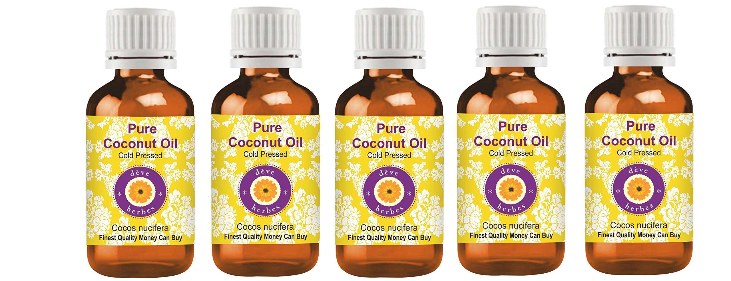 SATISFACTION AND PURITY - We, the manufacturer, Deve Herbs, guarantee that our oils are pure and natural. If you are not satisfied for any reason, we will replace your product or refund your money. We believe our oils will provide you with lasting therapeutic benefits. We believe in our products and have offered a no-questions-asked money-back guarantee for 13 years. For application to skin and hair - Cold-pressed oils or carrier oils can be applied directly to the skin. They are derived from plant sources. Use them alone or with other oils to nourish your skin. They can also be used to dilute essential oils to help them penetrate the skin. AROMA: Carrier oils are NOT aromatic oils. Most natural carrier oils have a LOW OR NO AROMA. We do not add synthetic aromas to make our oils appealing, unlike many other brands. Coconut oil is used for therapeutic purposes and has a very low or no aroma. Features - Pure, natural, undiluted, therapeutic grade, alcohol-free, solvent-free, cruelty-free, paraben-free, single-ingredient, additive-free, preservative-free, unscented, vegan, suitable for all skin types. Additional Uses - Carrier oils are widely used in beauty products for hydration, nourishment, and aromatherapy. Quantity - 100ml x 5 (16.9 oz), Container Type - High-quality amber glass bottle designed to preserve potency. Extraction Method - Cold-pressed, Botanical Name - Cocos nucifera, Daily Skincare Regimen, Lightweight, Non-greasy, Non-sticky, For all seasons.