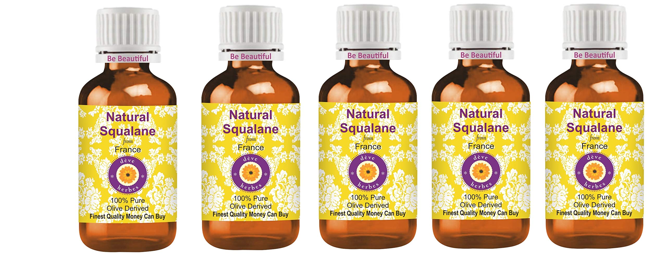 Deve Herbes Pure natural Squalane oil (from olives) 100 natural therapeutic grade for personal care WE GUARANTEE: Highest quality pure, natural and undiluted oils. If you are not satisfied, you can get a 100 refund even after using the product. Try it risk-free with no-questions-asked 100 money back guarantee. ABOUT DEVE HERBES: Dève Herbs is a privately held essential oil company specialized in sourcing the finest natural essential oils from native crop areas around the world. With the largest range of essential and carrier oils in the world, Deève Herbs has over a million highly satisfied customers in more than 100 countries. Our oils are natural, pure, undiluted, with traceable origin, of the highest quality and with a 100 money back guarantee. Our range also includes essential oil blends, aroma oils, natural herbs, body butters, floral waters and waxes.Thanks for shopping Note: Best before 36 months from date of packaging stated on the box INSTRUCTIONS FOR USE How to use: Cold-pressed or carrier oils can be applied directly to the skin. It is derived from plant sources. Use it alone or with other oils to nourish your skin. It can also be used to dilute essential oils to carry them into the skin. Please note: this product does not have a child safety hood. Keep away from children.How to use: carrier oil can be applied directly to the skin. It is derived from plant sources. Use it alone or with other oils to nourish your skin. It can also be used to dilute essential oils to carry them into the skin. Please note: this product does not have a child safety hood. Keep away from children. AROMA: Carrier oils are not aromatic oils. Most natural carrier oils have FAINT OR NO AROMA. We don't add synthetic aromas to make our oils attractive, unlike many other brands. Pure Natural Squalane Oil (from olives) is used for therapeutic purposes and has very weak or no aroma. Tens of thousands of our customers have experienced its therapeutic benefits. Quantity - 100ml 100 pure, natural, undiluted, premium, therapeutic grade carrier oil, alcohol-free, solvent-free, vegan, cruelty-free, not tested on animals. Method of extraction: Cold pressed. FINEST QUALITY MONEY CAN BUY. 100 SATISFACTION PURITY GUARANTEE - We, the manufacturer, Deve Herbes, guarantee that our oils are pure and natural. We offer a 100 satisfaction guarantee on our products. If for any reason you are not satisfied, we will replace your product or refund your money. We believe our oils will give you lasting therapeutic benefits. We believe in our products and have been offering a 'No Questions Asked Money Back Guarantee' for 9 years.Deve Herbes Pure natuurlijke Squalane olie (afgeleid van olijven) 100 natuurlijke therapeutische kwaliteit voor persoonlijke verzorging (Pack van vijf) 100ml X 5 (16,9 oz) Deve Herbes Pure natuurlijke Squalaan olie (afkomstig van olijven) 100 natuurlijke therapeutische kwaliteit voor persoonlijke verzorging WE GARANTIE: Hoogste kwaliteit zuivere, natuurlijke en onverdunde oliën. Als u niet tevreden bent, kunt u een 100 terugbetaling krijgen, zelfs na gebruik van het product. Probeer het risico-vrij met no-questions-Asked 100 geld-terug-garantie. OVER DEVE HERBES: dève kruiden is een particulier bedrijf voor etherische olie gespecialiseerd in de aankoop van de beste natuurlijke etherische oliën uit inheemse gewasgebieden over de hele wereld. Met het grootste assortiment essentiële en drageroliën ter wereld heeft deève kruiden meer dan een miljoen zeer tevreden klanten in meer dan 100 landen. Onze oliën zijn natuurlijk, zuiver, onverdund, met traceerbare oorsprong, van de hoogste kwaliteit en met 100 geld terug garantie. Ons assortiment omvat ook etherische olie blends, aroma-oliën, natuurlijke kruiden, bodyboters, bloemenwater en was.Bedankt voor het winkelen Opmerking: Beste vóór 36 maanden vanaf datum van verpakking vermeld op de doos GEBRUIKSAANWIJZING Hoe te gebruiken: koudgeperste of drageroliën kunnen direct op de huid worden aangebracht. Het is afgeleid van plantaardige bronnen. Gebruik het alleen of met andere oliën om je huid te voeden. Het kan ook worden gebruikt om essentiële oliën te verdunnen om ze in de huid te dragen. Let op: dit product heeft geen kinderveiligheidskap. Uit de buurt van kinderen houden.Hoe te gebruiken: draagolie kan direct op de huid worden aangebracht. Het is afgeleid van plantaardige bronnen. Gebruik het alleen of met andere oliën om je huid te voeden. Het kan ook worden gebruikt om essentiële oliën te verdunnen om ze in de huid te dragen. Let op: dit product heeft geen kinderveiligheidskap. Uit de buurt van kinderen houden. AROMA: drageroliën zijn geen aromatische oliën. De meeste natuurlijke drageroliën hebben FAINT OF GEEN AROMA. We voegen geen synthetisch aroma toe om onze oliën aantrekkelijk te maken, in tegenstelling tot veel andere merken. Pure Natural Squalaan Oil (afkomstig van olijven) wordt gebruikt voor therapeutische doeleinden en heeft zeer zwak of geen aroma. Tienduizenden van onze klanten hebben zijn therapeutische voordelen ervaren. Hoeveelheid - 100ml X 5 (16 oz) Container Type - Vijf hoge kwaliteit amber glazen fles van 100ml elk met vijf interne plastic Euro Dropper. 100 zuiver, natuurlijk, onverdund, premium, therapeutische kwaliteit dragerolie, alcoholvrij, oplosmiddelvrij, veganistisch, wreedheidsvrij, niet getest op dieren. Wijze van extractie: Koud geperst. FIJNSTE KWALITEIT GELD KAN KOPEN. 100 tevredenheid zuiverheid GARANTIE - Wij, de fabrikant, Deve Herbes, garanderen dat onze oliën puur en natuurlijk zijn. Wij bieden 100 tevredenheidsgarantie op onze producten. Als u om welke reden dan ook niet tevreden bent, vervangen wij uw product of terugbetaling van uw geld. Wij geloven dat onze oliën u blijvende therapeutische voordelen zullen geven. Wij geloven in onze producten en bieden al 9 jaar 'Geen vragen gesteld geld terug garantie' aan.