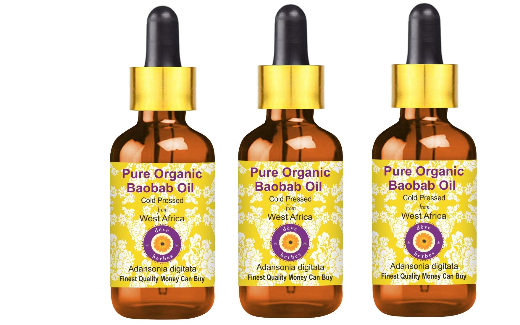 Deve Herbes Pure Organic Baobab Oil Adansonia digitata with Glass Dropper 100 Natural Therapeutic Grade Cold Pressed for Personal Care Pack of Three 100ml X 3 10 oz