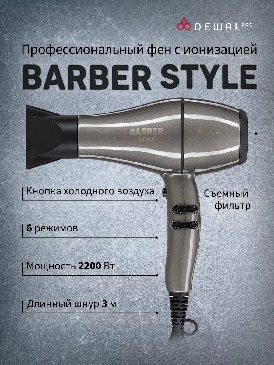 Компактный фен BARBER STYLE, разработанный специально для барберов. Стильное покрытие корпуса, имитирующее сталь. Профессиональный фен DEWAL PRO BARBER STYLE Compact – обладает компактным размером, маневренностью и большой мощностью, поэтому идеально подходит для работы в салоне. Благодаря компактному размеру, фен идеально подходит для сушки и укладки коротких волос, бороды, усов. Сопла скошенной формы существенно увеличивают скорость воздушного потока, а также помогают сделать процесс укладки брашингом более комфортным. Воздушный фильтр легко снимается и ухаживать за мотором фена не составит труда. Преимущества: мощный бесщеточный мотор – до 8 часов непрерывной работы; Высокая скорость воздушного потока. Корпус фена разработан с учетом оптимизации расхода воздуха; Защита от перегрева Stop-heat. Защитный механизм на нагревательном элементе фена охлаждает корпус, защищая мотор от перегрева, а также поддерживая оптимальную температуру. Технические характеристики: мощность 2200 Вт, система ионизации, вес 540 гр, 9 режимов работы, турбо-кнопка, 2 сопла, сетевой провод 3 м.