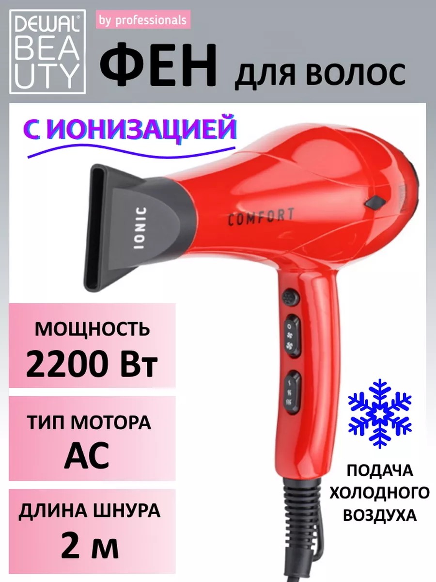 Фен для волос профессиональный DEWAL BEAUTY Comfort White/Black/Red (модель представлена в трех цветах-черный, белый, красный), 2200 Вт, 1 насадка .