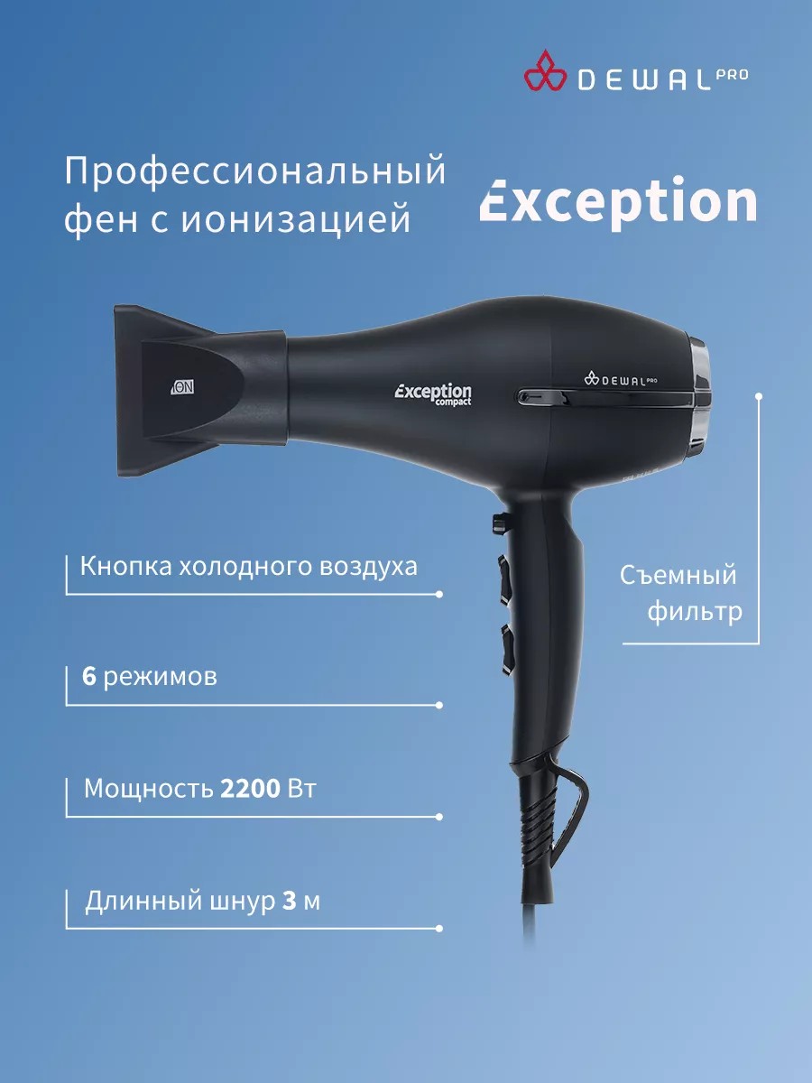 Профессиональный фен DEWAL EXCEPTION COMPACT обладает маневренностью и большой мощностью и поэтому идеально подходит для работы в салоне.