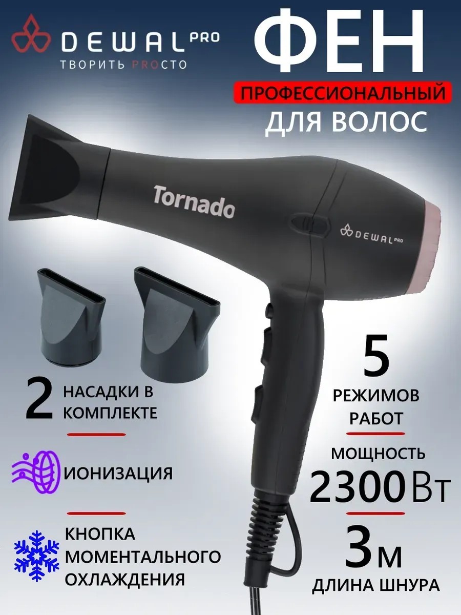 Фен DEWAL PRO TORNADO, серый, 2300Вт, ионизация, 2 насадки.