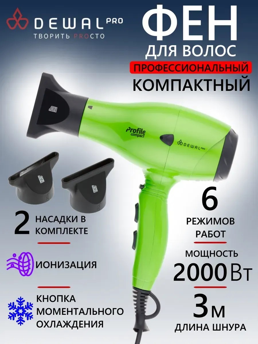 Фен DEWAL PROFILE COMPACT, зеленый, вес 600гр, 2000Вт, ионизация, 2 насадки, пров. 3м.