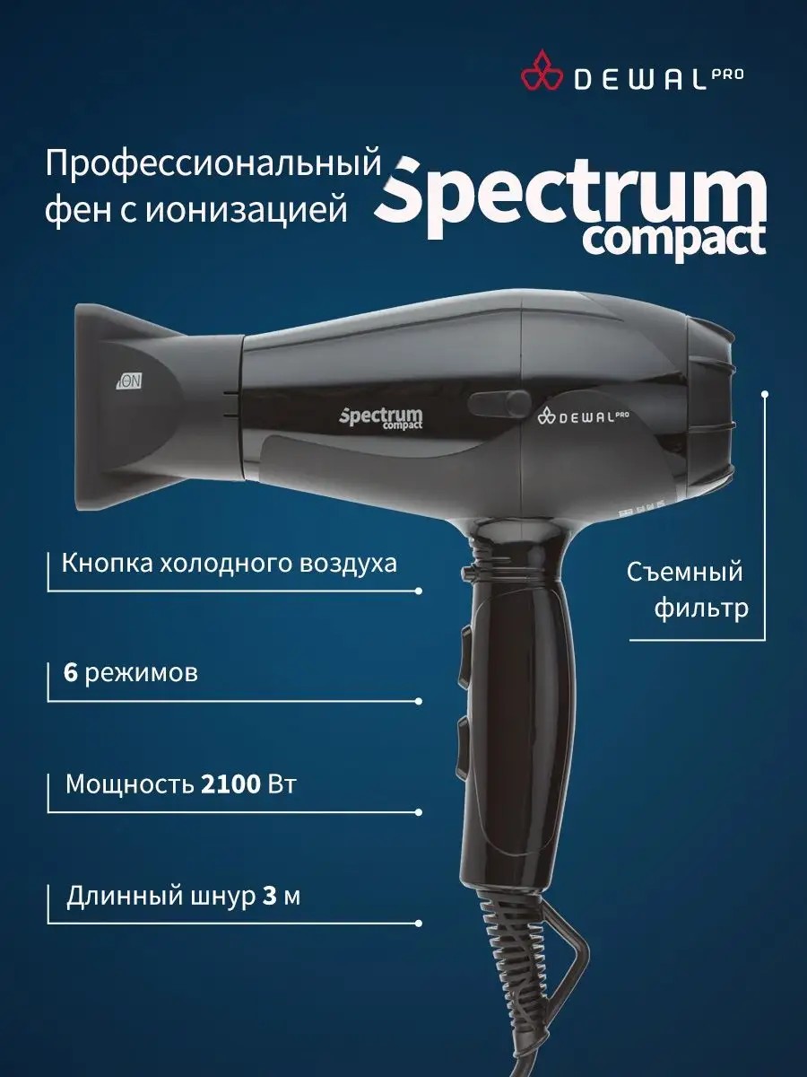 Фен для волос профессиональный с ионизацией от DEWAL серии Spectrum Compact - самый мощный из компактных фенов DEWAL. Размеры фена составляют 19 х 21 х 9 см. Его профессиональный мотор 2100 Вт создает мощный воздушный поток, который легко и быстро сушит волосы любого типа. Скорость воздушного потока 17,02 м/с. Фен для сушки волос удобно лежит и в мужской и женской руке. Съемный воздушный фильтр позволяет своевременно чистить мотор фена от пыли. Генератор, встроенный в ручку фена, создает отрицательно заряженные частицы ионов, которые благотворно влияют на здоровье волос, а также нейтрализуют статическое электричество. Фен имеет 2 скорости, 3 температурных режима и кнопку мгновенного охлаждения. Таким образом, можно выбрать индивидуальный режим сушки для каждого клиента.Преимущества фенов DEWAL: Мощный мотор - до 8 часов непрерывной работы; Высокая скорость воздушного потока. Корпус фена разработан с учетом оптимизации расхода воздуха; Защита от перегрева Stop-heat. Защитный механизм на нагревательном элементе фена охлаждает корпус , сохраняет мотор, защищая его от перегрева а также поддерживает оптимальную температуру для волос.