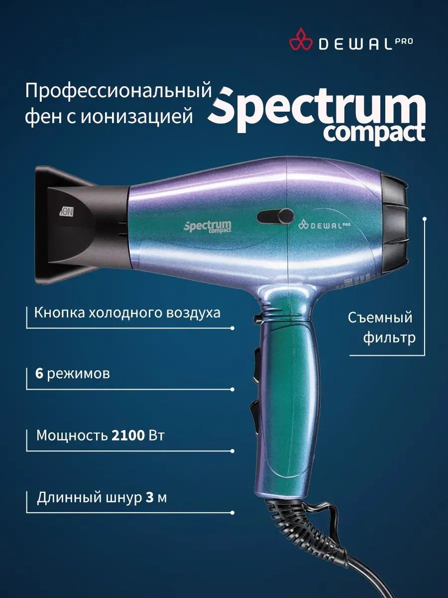 Фен для волос профессиональный с ионизацией от DEWAL серии Spectrum Compact - самый мощный из компактных фенов DEWAL. Размеры фена составляют 19 х 21 х 9 см. Его профессиональный мотор 2100 Вт создает мощный воздушный поток, который легко и быстро сушит волосы любого типа. Скорость воздушного потока 17,02 м/с. Фен для сушки волос удобно лежит и в мужской и женской руке. Съемный воздушный фильтр позволяет своевременно чистить мотор фена от пыли. Генератор, встроенный в ручку фена, создает отрицательно заряженные частицы ионов, которые благотворно влияют на здоровье волос, а также нейтрализуют статическое электричество. Фен имеет 2 скорости, 3 температурных режима и кнопку мгновенного охлаждения. Таким образом, можно выбрать индивидуальный режим сушки для каждого клиента.Преимущества фенов DEWAL: Мощный мотор - до 8 часов непрерывной работы; Высокая скорость воздушного потока. Корпус фена разработан с учетом оптимизации расхода воздуха; Защита от перегрева Stop-heat. Защитный механизм на нагревательном элементе фена охлаждает корпус , сохраняет мотор, защищая его от перегрева а также поддерживает оптимальную температуру для волос.