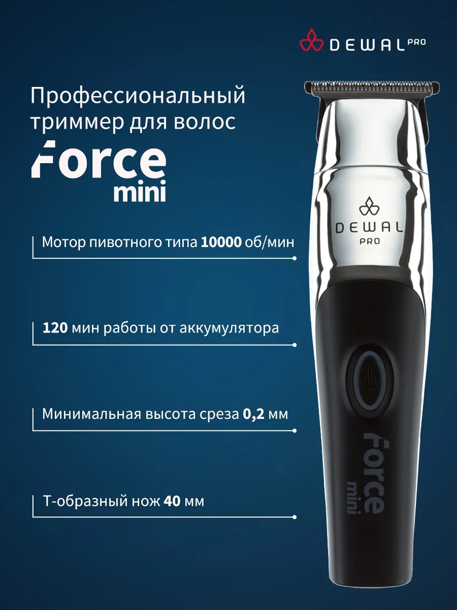 FORCE одна из самых мощных во всей линейке машинок для стрижки волосот DEWAL! к МАШИНКЕ для стрики волос. Надежный мотор роторного типа имеет скорость в 10 000 оборотов/мин при минимальном уровне шума и вибрации. Аккумуляторная Li-Ion батарея ёмкостью 2200 mAh позволяет работать без подзарядки до 120 минут, полная зарядка аккумулятора замет всего 70 минут.Нож шириной 45 мм изготовлен из японской высокоуглеродистой нержавеющей стали 440С (уровень твердости по шкале роквелла 62-63 единицы) - а значит он более устойчив к коррозии и износу, не нагревается даже при длительной работе, при этом отлично поддается заточке!Широкий диапазон регулировки высоты среза от 1 мм до 3,3 мм с надежной фиксацией выбранного положения делаю машинку универсальной -окантовочные работы будут выполнены с ювелирной точностью!DEWAL FORCE оснащена 3-х метровым сетевым кабелем - если аккумулятор разрядился в процессе стрижки, возможно продолжить работу от сети.Технические характеристики к триммеру на фото.