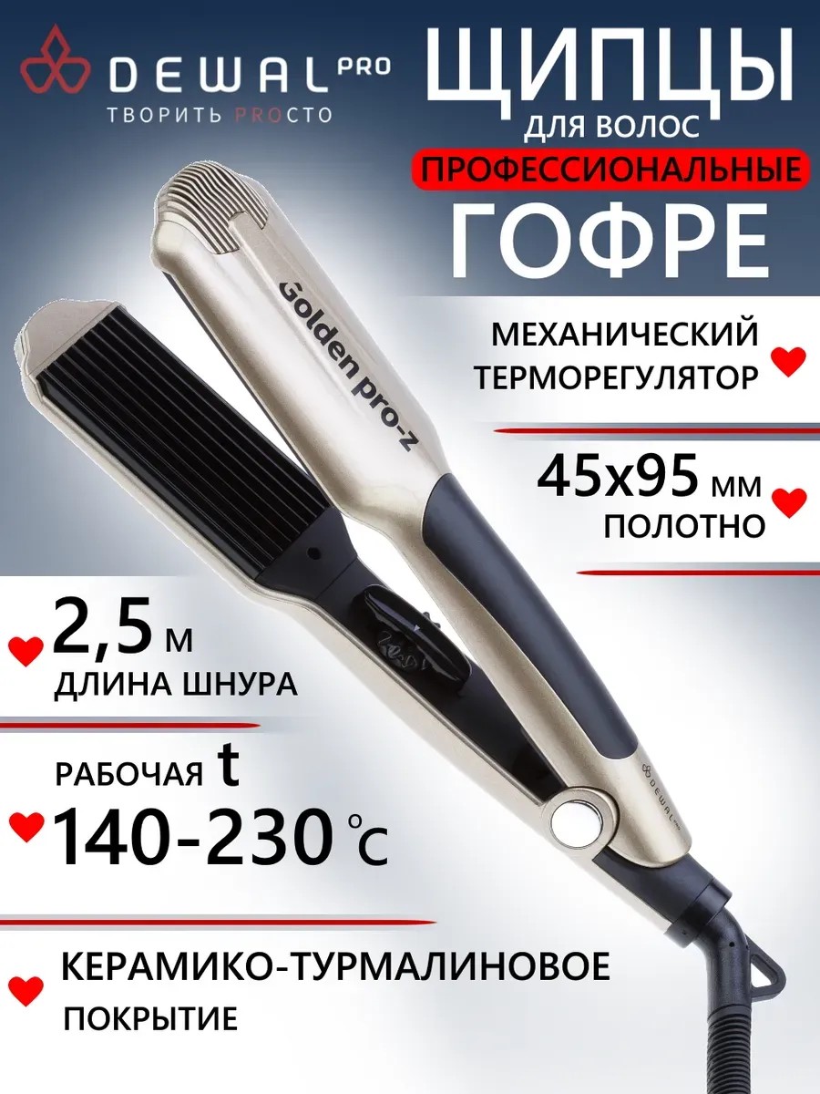 GOLDEN PRO-Z DEWAL 03-030Z Crimping Iron. DEWAL PRO GOLDEN PRO-Z Crimping Iron, 45x95mm, ceramic-tourmaline coating, 48 W. The DEWAL PRO GOLDEN PRO-Z Crimping Iron is a high-quality professional tool equipped with a crimping function. - The crimping iron gently affects the hair structure, allowing you to safely create hairstyles without the risk of damage to your hair. The plates of the device have a ceramic-tourmaline coating, which protects the hair during styling and provides a beneficial effect on its structure using the ionization function. - The DEWAL PRO GOLDEN PRO-Z crimping iron is strong and durable, ideal for daily professional use. Thanks to the ceramic coating, the device ensures uniform heating - curls quickly acquire the desired shape and a flawless look. Hair becomes more elastic and shiny thanks to the negative ions emitted by tourmaline. This professional curling iron has an optimal power output of 48W, and the plate surface operates at a temperature of 140 to 230 degrees Celsius. The plate creates a medium crimp, which is ideal for all hair types. The design features a convenient rotating cord. Features: • Auto power-off - after 60 min • Brand - DEWAL • Product weight - 0.496 kg (in a pack. 0.629 kg) • Length of working blades, cm - 9.5 • Cord length - 2.5 m • Maximum operating temperature, C - 230 • Body material - Shockproof plastic • Minimum operating temperature, C - 140 • Power, W - 48 • Plate coating - Ceramic-tourmaline • Other features - Super-fast heating of blades • Operating temperature, C - 140 - 230 • Size of working blades, mm - 45 x 95 • Product dimensions - 29 x 5 x 4 cm (in a pack. 31 x 15 x 5 cm) • Country of origin of the brand - Germany • Thermostat - Mechanical • Type - Hair corrugation tongs • Plate type - Fine corrugation • Color - Golden • Width of working webs, cm - 4.5