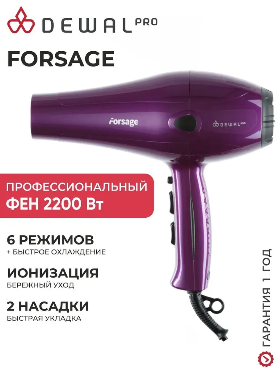 The DEWAL Forsage 03-106 Purple professional hair dryer is a model with a new generation motor that lasts 15% longer.