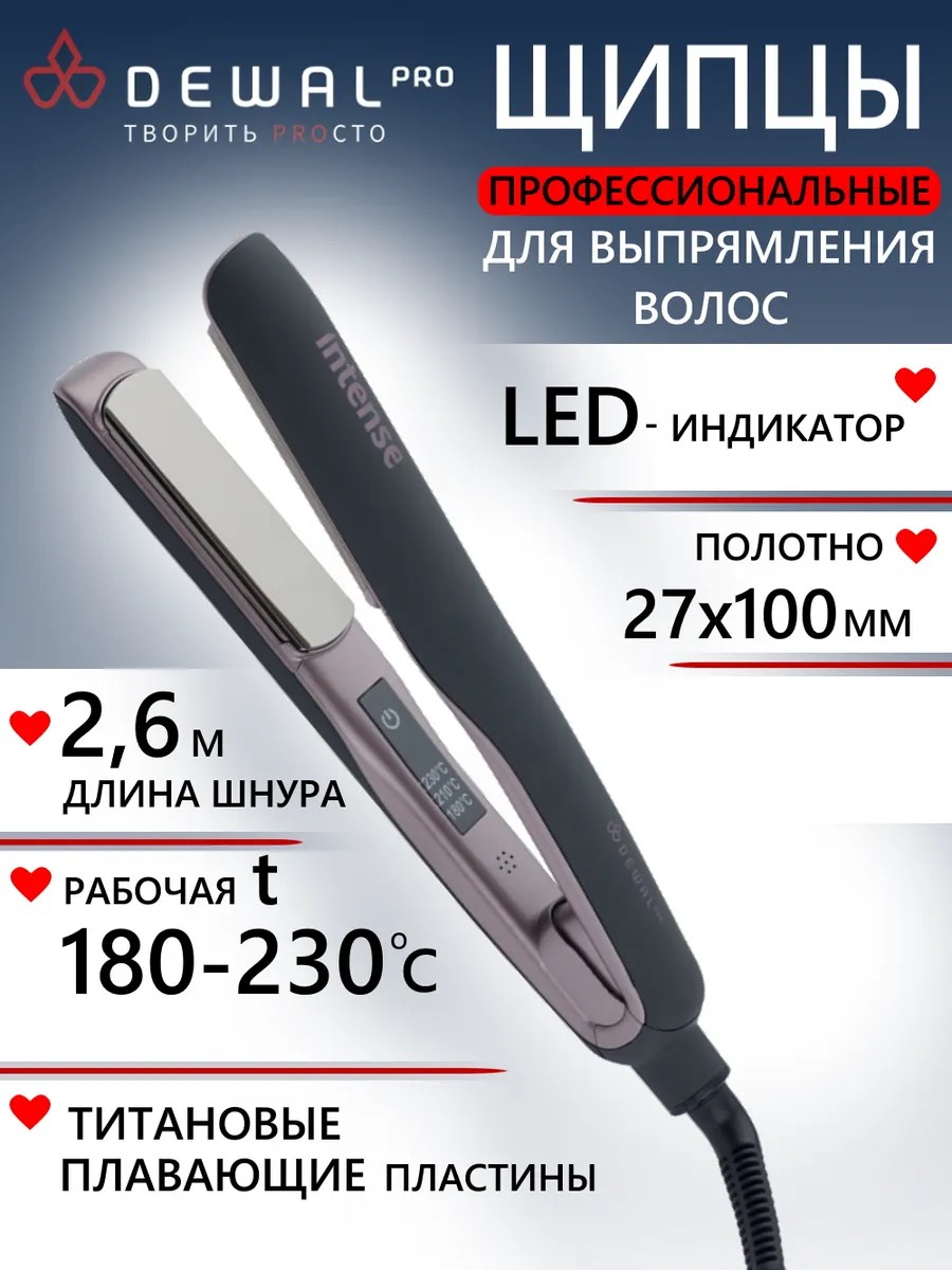 Hair straightening iron DEWAL PRO INTENSE, gray, 27x100 mm, with thermostat, titanium coating, 53W