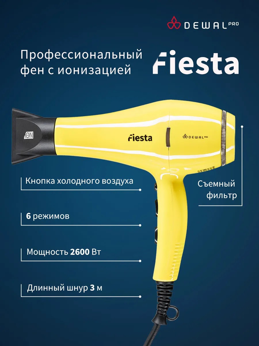 Профессиональный фен 03-2010 DEWAL FIESTA – обладает маневренностью, большой мощностью 2600 Вт и идеально подходит для работы в салоне!