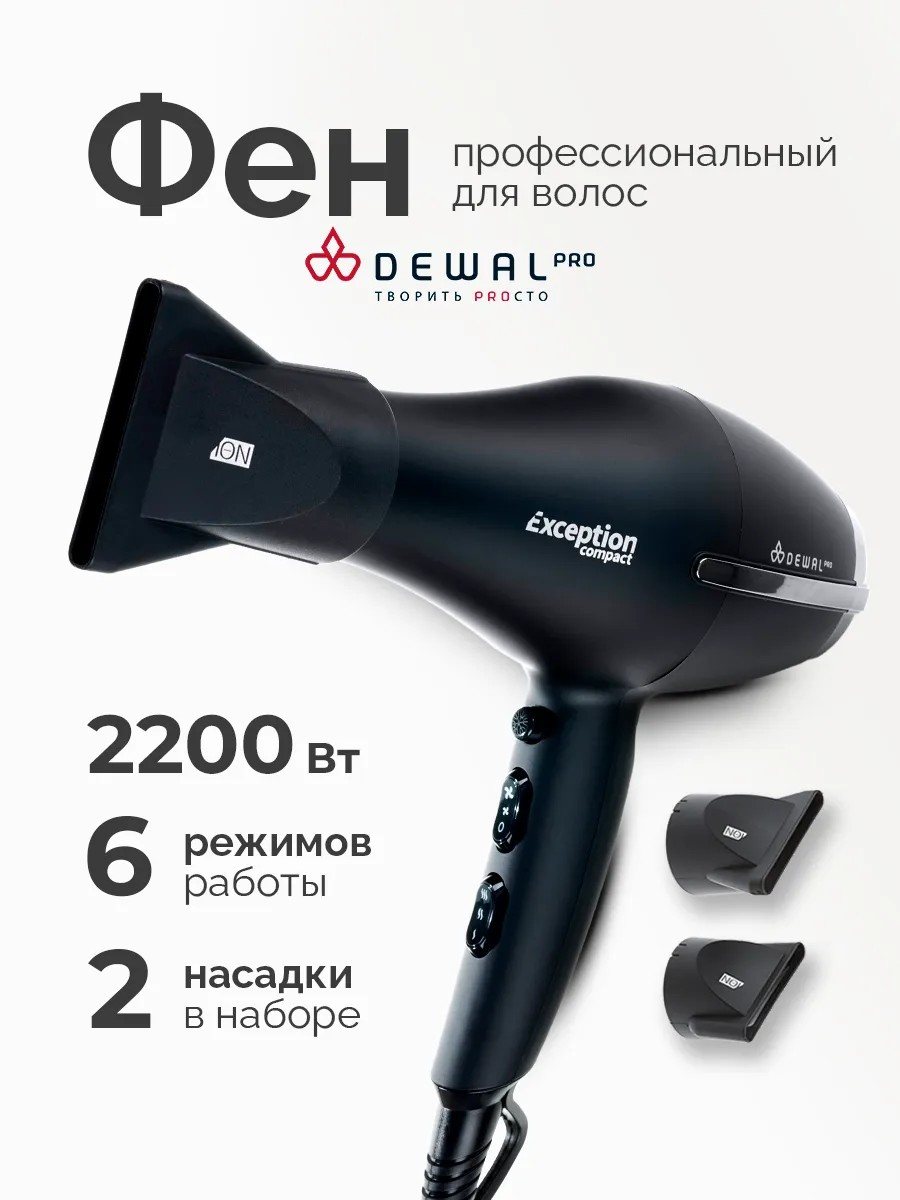 Фен для волос Dewal Pro Exception Compact — мощный и маневренный профессиональный фен для салонной и домашней укладки. Благодаря компактному корпусу длиной всего 18 см и весу 550 г, он удобно ложится в руку и позволяет комфортно работать даже при длительных укладках.