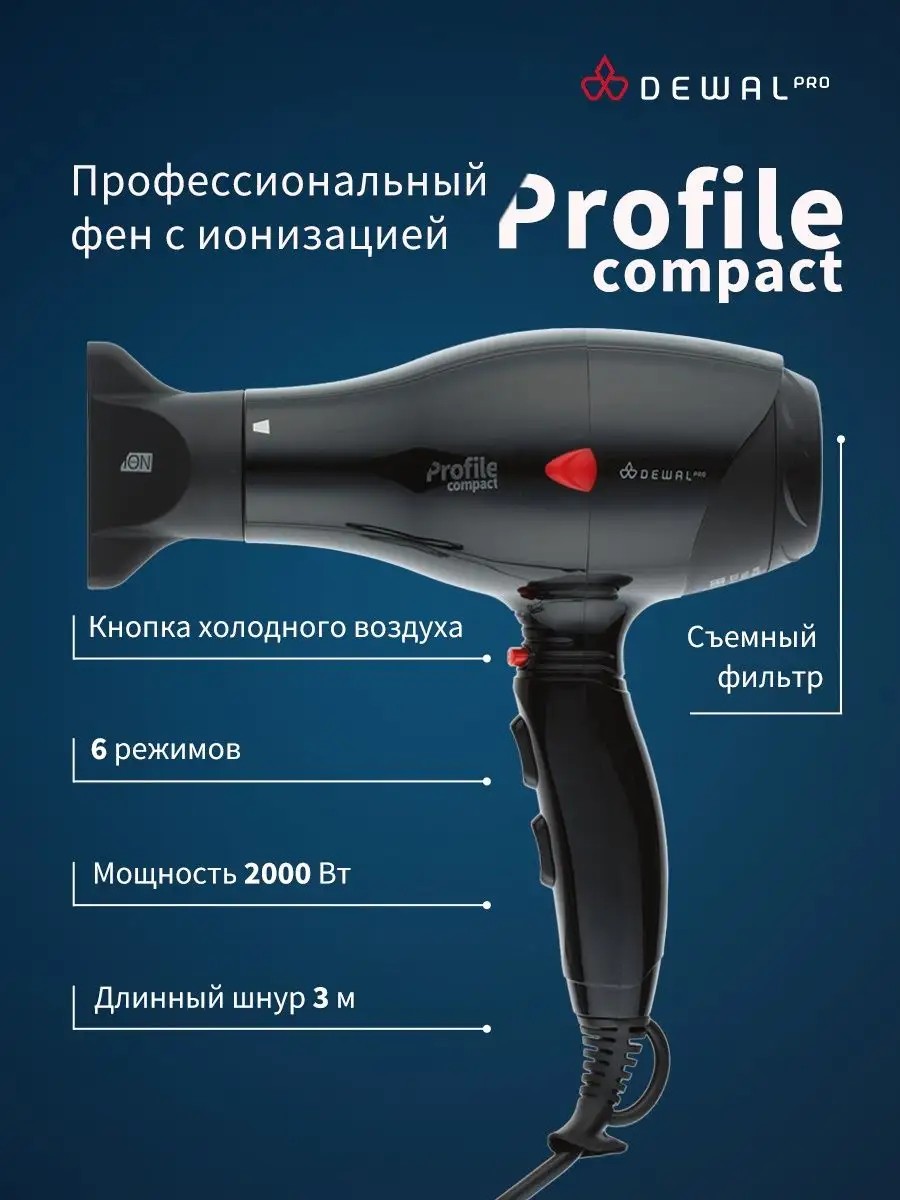 The Profile Compact professional hair dryer is a convenient and reliable tool with the necessary features for a professional hair dryer. The ionization function, reliable professional motor, removable air filter, cold air button, and convenient switching buttons guarantee comfortable work for professionals. The hair dryer is made of impact-resistant plastic with a protective insert on the body, thus significantly reducing the risk of damage in case of an accidental fall. The improved nozzle fits tightly to the body, thanks to which hair does not get tangled during styling. Advantages of DEWAL styling devices: Powerful motor - up to 8 hours of continuous operation; High airflow speed. The body of the hair dryer is designed to optimize air flow; Stop-heat protection against overheating. The protective mechanism on the heating element of the hair dryer cools the body, preserves the motor, protecting it from overheating, and also maintains the optimal temperature for hair. The hair dryer with attachments has a cord length of 3 m.