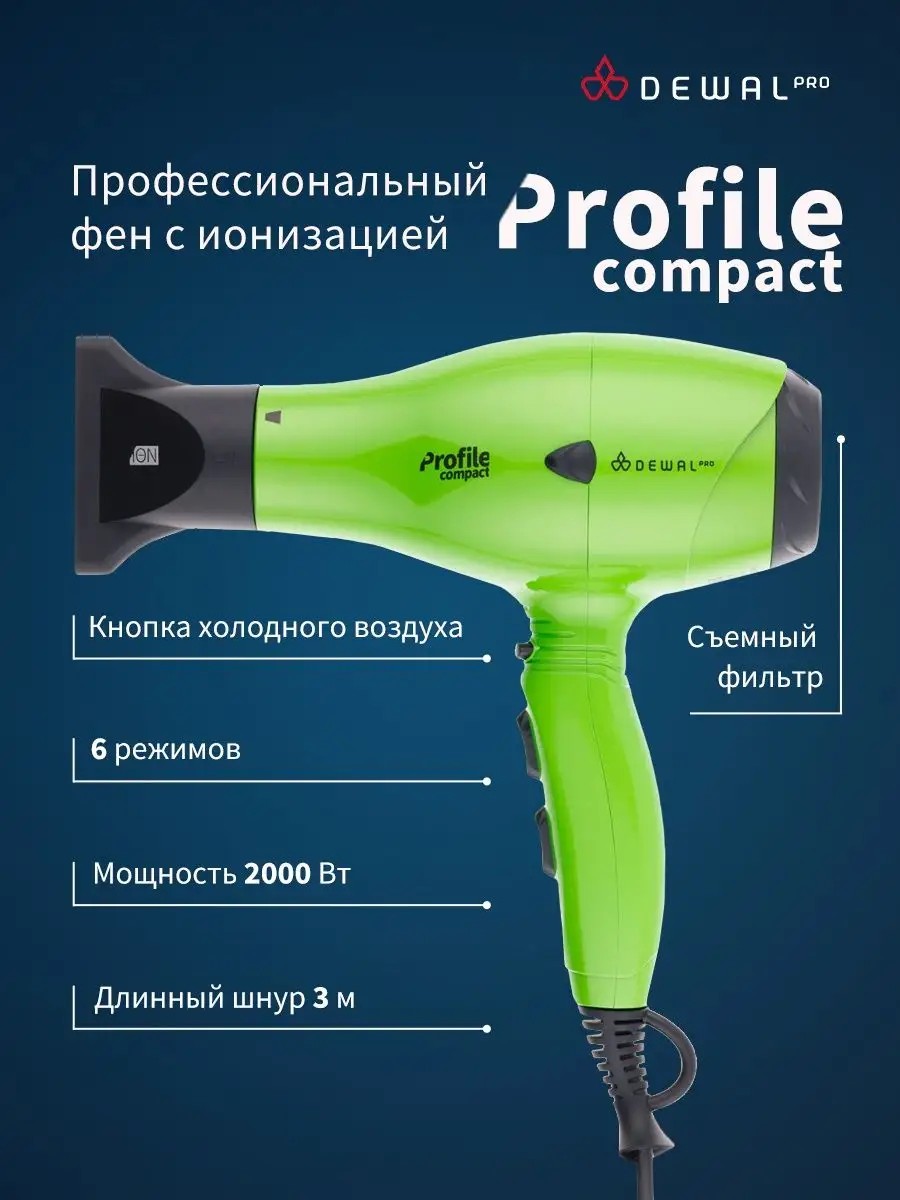 The Profile Compact professional hair dryer is a convenient and reliable tool with the necessary features for a professional hair dryer. The ionization function, reliable professional motor, removable air filter, cold air button, and convenient switching buttons guarantee comfortable work for professionals. The hair dryer is made of impact-resistant plastic with a protective insert on the body, thus significantly reducing the risk of damage in case of an accidental fall. The improved nozzle fits tightly to the body, thanks to which hair does not get tangled during styling. Advantages of DEWAL styling devices: Powerful motor - up to 8 hours of continuous operation; High airflow speed. The body of the hair dryer is designed to optimize air flow; Stop-heat protection against overheating. The protective mechanism on the heating element of the hair dryer cools the body, preserves the motor, protecting it from overheating, and also maintains the optimal temperature for hair. The hair dryer with attachments has a cord length of 3 m.