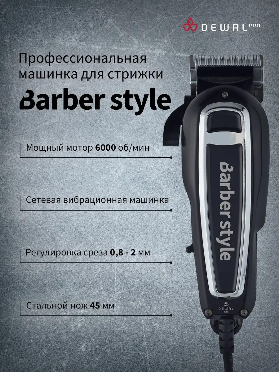BARBER STYLE professional vibrating hair clipper. Made in a classic style, in black with metal inserts. It fits perfectly in the hand, without causing discomfort even during a long haircut, for both men and women. The clipper is equipped with a cutting performance height lock. The cutting adjustment lever is improved with stop slots that securely fix its position, falling into special grooves on the body of the clipper. Adjustable cutting height 0.8 mm - 2 mm. The hair clipper is mains-powered - powered from the mains, and a long cord will provide convenience and freedom of movement - 2.5 m. Powerful vibration motor 6000 rpm, power 10 W, weight 490 g, metal blade width 45 mm, 6 attachments, cleaning brush, blade oil included.