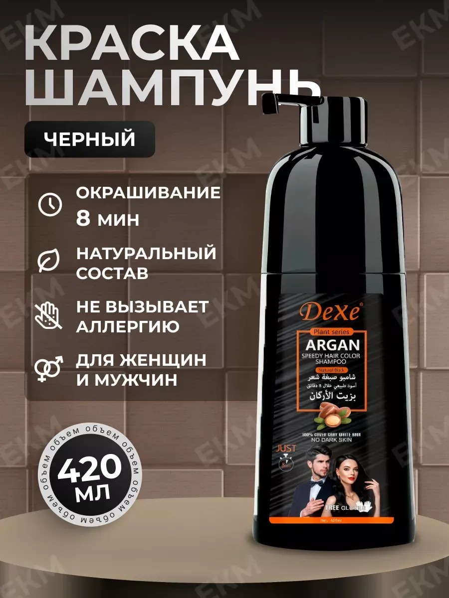DEXE argan hair shampoo - тонирующий для быстрого, безопасного и натурального окрашивания. Шампунь - краска для седых и сухих волос - это именно то, что вам нужно для тщательного ухода волосом. Содержит множество растительных экстрактов, может восполнить питательные вещества, необходимые волосам. Используя мягкую формулу, не раздражает, не содержит аммиака и перекиси, не повреждает и эффективно закрашивает седину. Поможет вам вернуть естественно выглядящий черный цвет. Он подходит как для женщин так и для мужчин. Оттеночный содержит натуральную растительную эссенцию: женьшень, имбирь, аргановое масло, черный кунжут и экстракт алоэ питают шелковистость и делают темными и блестящими. Polygonatum Cyrtonema может укрепить корни и сделать волосы сильными и мягкими, что обеспечит профессиональный уход в удобной домашней обстановке. Без запаха, не только окрашивает, но и ухаживает. Благодаря восстанавливающим компонентам в составе, он делает ваш волос мягкой и блестящей. Тонирующий обеспечивает стойкое окрашивание седины, сохраняя насыщенный цвет на 3-4 недели. Вы можете наслаждаться красивой прической без необходимости постоянно поправлять цвет. Краска для вьющихся, легка в использовании. Просто наденьте наши перчатки, выдавите и нанесите его, равномерно втирайте его в течение 5 минут, чтобы покрыл все волосы и кожу головы, держите его около 10-15 минут (20 минут для полного покрытия) и тщательно смойте. Он подарит вам черные блестящие волосы! Просто нанесите его на влажную голову, оставьте на несколько минут и тщательно смойте. Это удобно и экономит ваше время. Он спроектирован так, чтобы обеспечить уход и окрашивание для всех типов. Теперь у вас есть возможность наслаждаться профессиональным уходом и красивой прической в любое время.