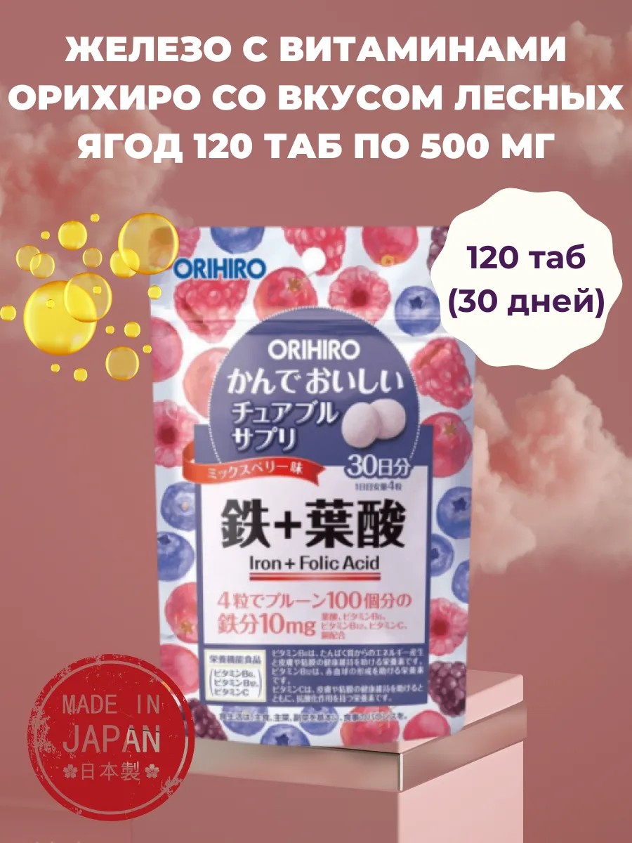 Orihiro Iron жевательные витамины железо, фолиевая кислота и витамины вкус ягод 120 жевательных таблеток. Японский БАД: Железо и Витамины Группы В для Вашего Здоровья