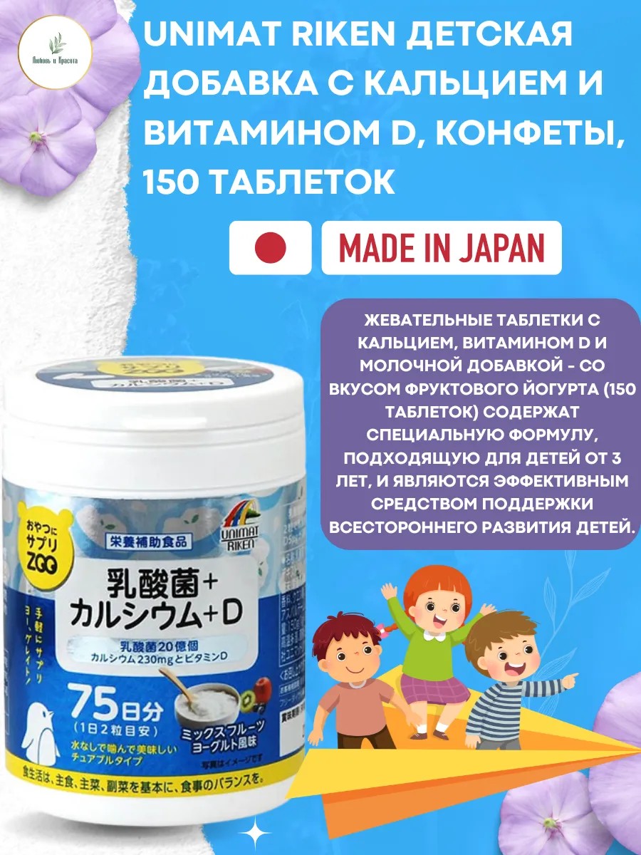 UNIMAT RIKEN ZOO Lactobacilli, Calcium, Vitamin D - chewable vitamins with yogurt flavor, to replenish the lack of calcium in the body.