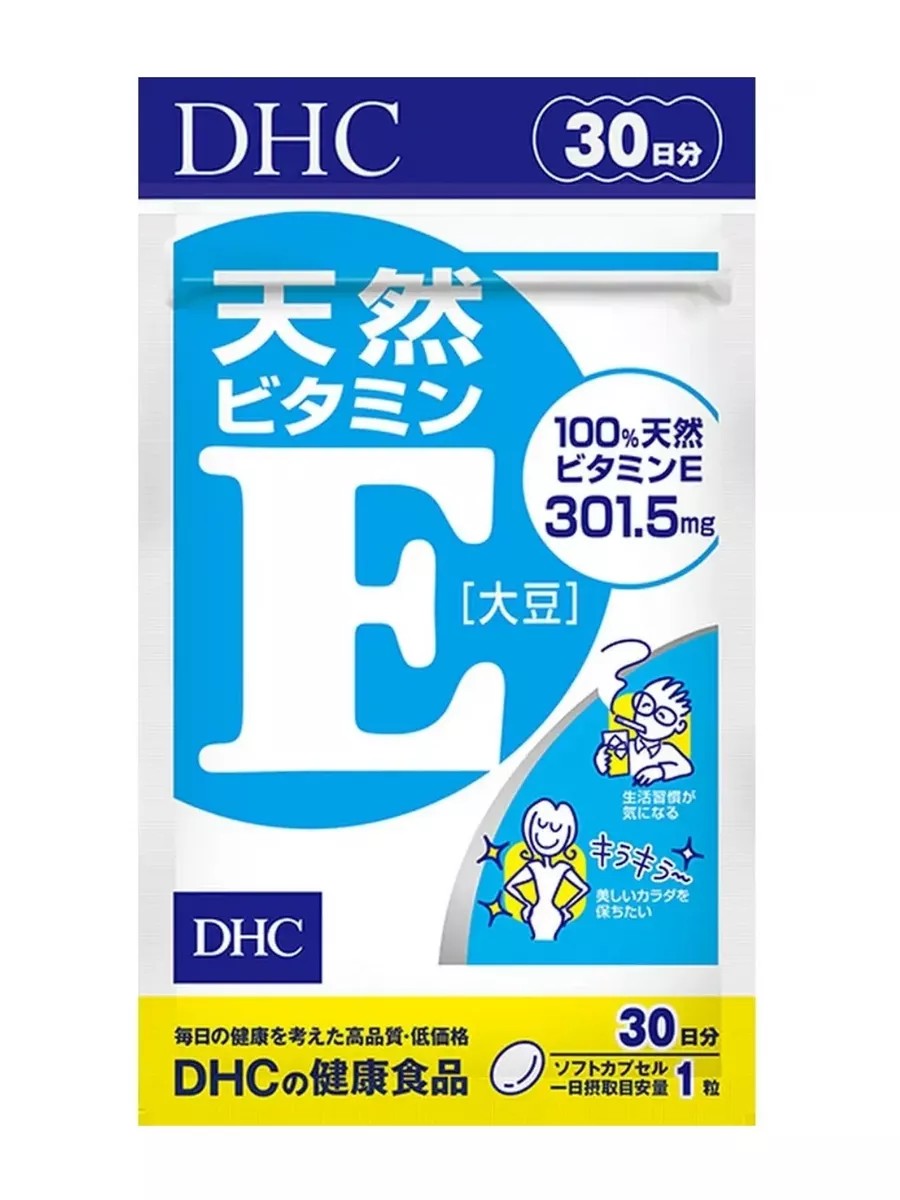 DHC Натуральный витамин Е из масла сои 30 капсул на 30 дней приема.Витамин Е необходим всем тканям организма, особую потребность в токофероле испытывает кровеносная система. Также он важен для сохранения молодости и красоты, упругости и подтянутости кожи. Получить его вместе с пищей можно, если включить в рацион орехи, тыкву, растительные масла. Однако для восполнения суточной потребности нужны большие порции, которые сопровождаются высокой калорийностью.Решить эту проблему поможет японский препарат с натуральным витамином Е, полученным из растительного сырья, от японского производителя. Он восполнит суточную потребность организма, позаботится о вашем здоровье, молодости и привлекательности.Состав и пользаГлавный активный компонент японского витамина – токоферол, добытый из соевого масла. Он легко усваивается организмом человека и не добавляет лишних калорий к вашему рациону.Натуральный витамин Е для организма человека:является мощным природным антиоксидантом – нейтрализует свободные радикалы, препятствует преждевременному старению, очищает клетки от токсинов;укрепляет иммунитет;снижает окислительные процессы в клетках, уменьшая риск развития онкологии;улучшает эластичность сосудов;нормализует текучесть крови, препятствует образованию тромбов;снижает показатели вредного холестерина в крови;улучшает кровообращение и регенерацию клеток, повышает упругость кожи, выравнивает ее тон;регулирует липидный состав дермы, препятствуя появлению высыпаний;нормализует работу репродуктивной системы;улучшает состояние волос, делает их более послушными, блестящими;обеспечивает доступ кислорода к эритроцитам и предупреждает их распад, принимает участие в тканевом дыхании;стимулирует синтез собственного коллагена в клетках.ПоказанияБлагодаря обширному списку полезных свойств употребление добавки из Японии на основе витамина Е особенно необходимо при таких состояниях:несбалансированное питание;гиповитаминоз Е;выраженный предменструальный синдром, нарушение менструального цикла;атеросклероз;спазм периферических сосудов;гипотрофия;мышечная дистрофия;активный образ жизни;частые стрессы, повышенная усталость;кожные проблемы – дерматозы, псориаз, повышенная сухость дермы;неврастения;сердечно-сосудистая недостаточность;восстановление после тяжелой болезни, перенесение патологий, сопровождающихся высокой температурой.Позаботьтесь о собственном здоровье, хорошем самочувствии и сохранении молодости. Включите биодобавку Натуральный витамин Е в свой рацион. Заказать ее вы можете у нас по выгодной цене.В одной капсуле содержится 301.5 мг витамина E, полученного из 100% растительных масел.Рекомендуется принимать:Тем, кого беспокоит его стиль жизни, кто хочет сохранить свое тело красивым.Способ применения: 1 капсула в день, запивая водой, не разжевывая.Состав: альфа-токоферол 301,5 мг ( полученный из сои), желатин, глицерин. Калорийность 3,6 ккал, белки 0,13 г, жиры 0,33 г, углеводы 0,03 г, солевой эквивалент 0,001 г