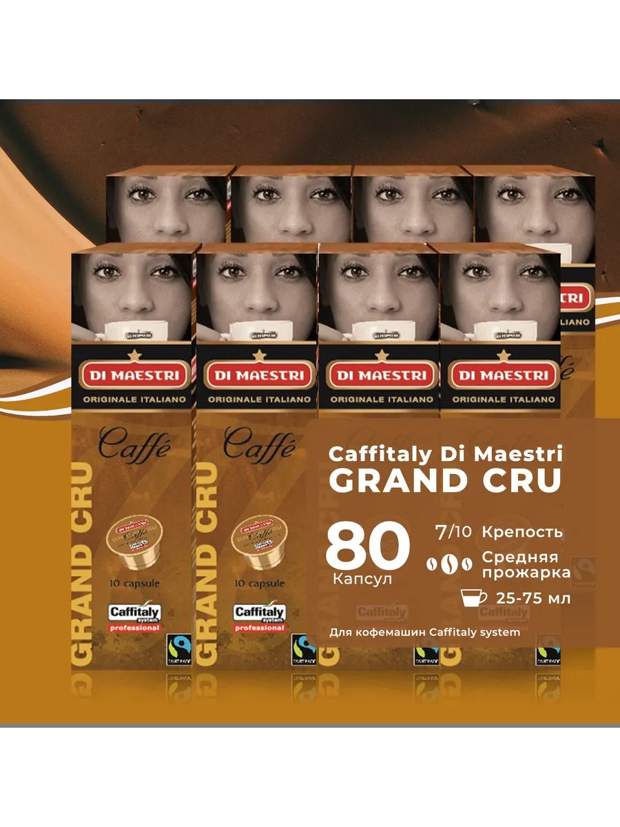 | Комплектация | Кофе Di Maestri Grand Cru - 8 упаковок по 10 капсул, картонная коробка |