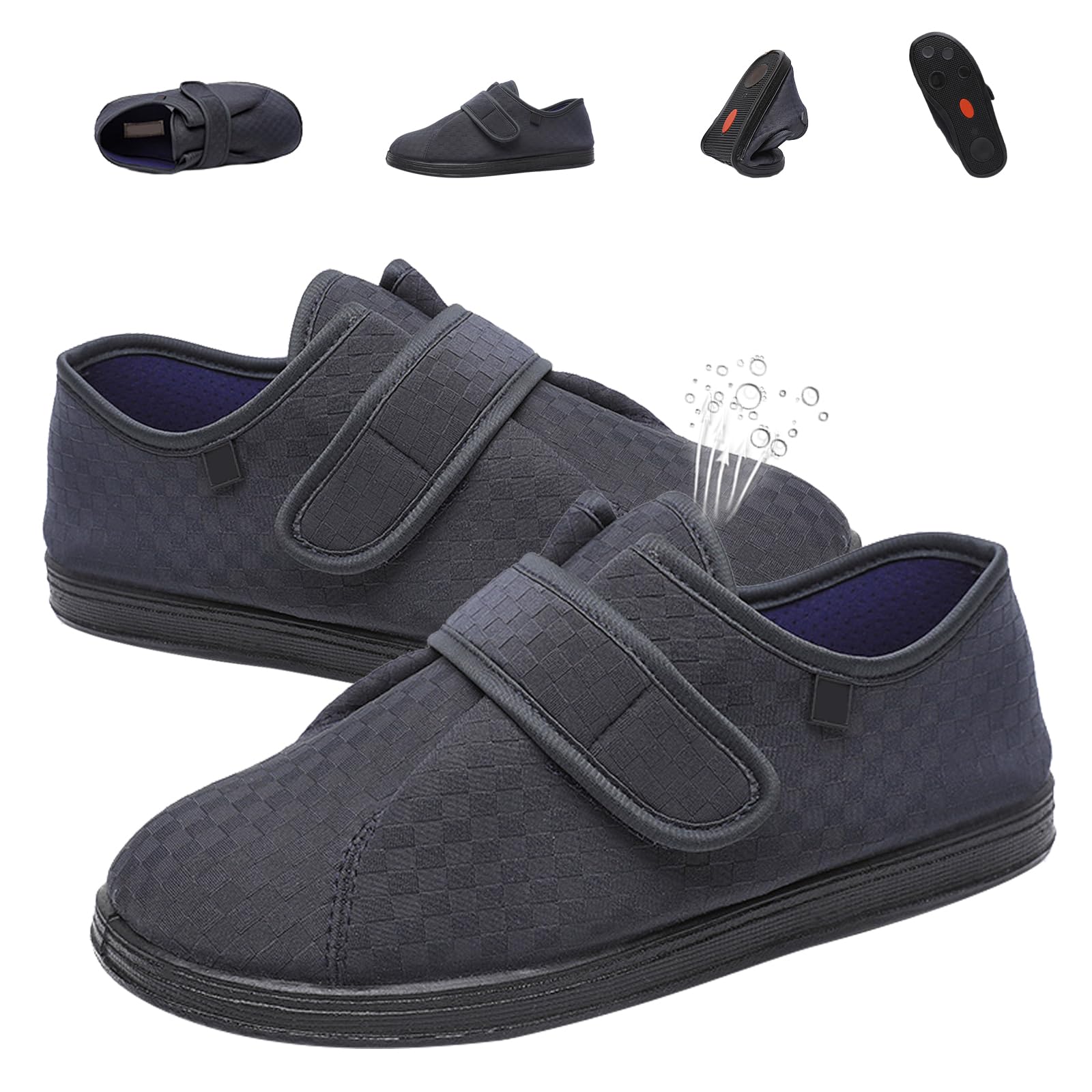 ?USERS AND USAGE SCENARIOS?Walking shoes for the elderly are suitable for men and women with diabetes,wide feet,swollen feet,edema,arthritis and other problems involving tendons.They are suitable for gardens,indoors, outdoors,outings and other scenes. ?LIGHT AND COMFORTABLE?Lightweight and breathable shoes are made of lightweight fabrics and are lightweight.The shoes will not burden your feet.The soft shoe lining will not rub your feet,providing protection for your feet and increg comfort. ?NON SLIP SHOCK ABSORPTION?The soles of the widened sports shoes are designed with a unique non slip texture to increase friction with the ground.The soles reduce pressure on the soles of the feet,increase cushioning and shock absorption and improve stability when walking. ?ADJUSTABLE DESIGN?This upper of the outdoor shoes adopts an adjustable design,which is easy to put on and take off.The tightness of the upper can be adjusted according to the changing state of the foot,increg the space for the toes to move and providing a comfortable experience. ?BREATHABLE FABRIC?This uppers of diabetic shoes are designed with breathable fabric.The uppers are soft and maintain internal air circulation,allowing for circulation and breathability.The interior absorbs moisture and wicks away sweat,keeping feet fresh and dry.