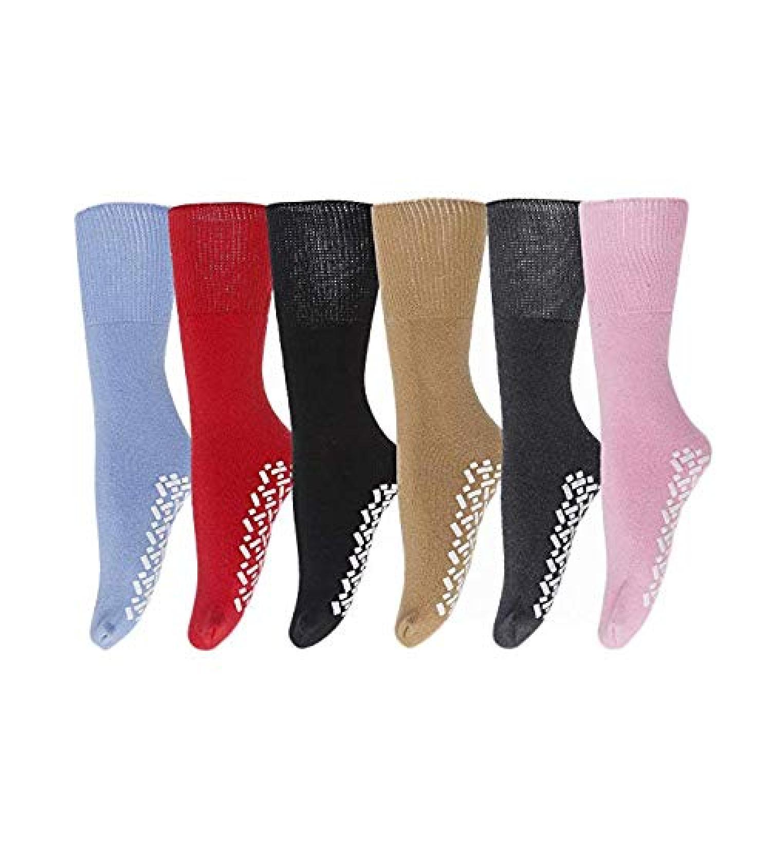 LIGHTWEIGHT & COMFORTABLE: Women's solid color diabetic crew socks. Lightweight and non-binding great for blood circulation. Loose fitting style won’t constrict your legs and slips on easily over swollen ankles and feet. The absolute best pair of socks for people who suffer from edema, diabetes and nephropathy. Perfect for recovery after surgery or long hospital stays. RUBBER GRIPPER BOTTOM: Rubber gripper bottom in these slipper socks fosters safety and prevent you from slipping and falling. Anti-skid features help to move easily even stepping down the ladder at night. NON-SKID SOCKS: These slipper socks have non-skid bottom. That is why nursing home socks are great for slipper floors. HOSPITAL & NURSING HOME SOCKS: Slipper socks are great for wearing at hospitals. Due to its design you can wear hospital socks all day long and your feet will be relaxed and dry. These socks help you to deal with swollen feet. 6 PAIRS OF SLIPPER SOCKS FOR WOMEN: Every person prefer comfort in their clothes equally at home and outdoors as much as possible. These slipper socks meet this requirement easily. Somes in 6 different colors. Your get 1 pair of each color.