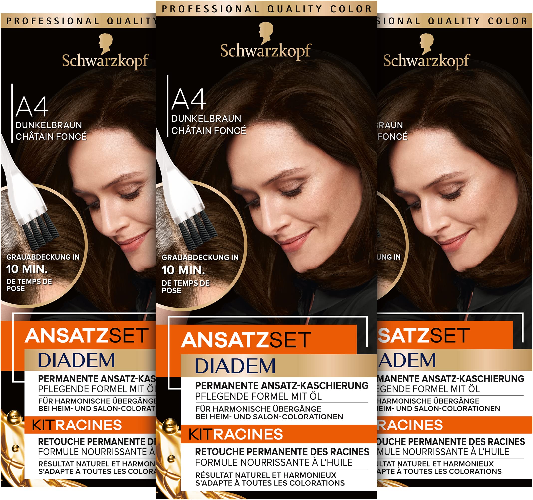 Diadem Root Touch-Up Kit – Permanent Lamination in Just 10 Minutes The Diadem Root Touch-Up Kit is the easy way to conceal your roots between colorings in just 10 minutes. The Diadem Root Touch-Up Kit is suitable for all permanent hair colors, even salon shades. The included hair coloring brush allows for simple and convenient application for seamless blending. Its nourishing, oil-based formula provides 100 gray lamination and intensive hair care. Thanks to the proven Color-Match system, transitions are seamlessly concealed, regardless of the previous color. The appropriate shade can be chosen from 6 different tones: blonde, light to medium brown, golden brown, reddish brown, dark brown, and black. With the Diadem Root Touch-Up Kit, there's no need to worry. Product Benefits in Detail: Coating in 10 minutes. Color Match System. Nourishing Oil Formula High-Precision Brush 100 Gray Lamination Directions: 1. Pour the color cream and developer emulsion into the mixing bowl. 2. Mix thoroughly until you obtain a smooth, even cream. 3. Now apply the mixture evenly to dry hair, focusing on the visible roots along the part and around the hairline. 4. Rinse thoroughly after the processing time. Please refer to the instruction manual for further information. Note: Empty the developer bottle completely. Keep out of reach of children. Keep developers away from heat. Do not store unused mixture. INGREDIENTS Hair coloring dyeing, oxidizing: Aqua (water, water, water, cetearyl alcohol, paraffin liquidum (mineral oil, mineral oil), ammonium hydroxide, laureth-6 carboxylate, coconut alcohol, toluene-2,5-diamine, sodium myreth sulfate. Ceares eth-50 Potassium Hydroxide Resorcinol Acrylamidopropyltrimonium Chloride Acrylates Copolymer Coco-Glucoside Glyceryl Oleate Ceteareth-12 Ceteareth-20 Sodium Sulfites Parfum (Fragrance) m-Aminophenol Sodium Silicate Etidronic Acid Ascorbic Acid, Sodium Chloride, Citric Acid, Ammonium Sulfate, 2-Amino-4-Hydroxyethylaminoanisole Sulfate, Phenoxyethanol, alpha-Isomethyl Ionone, Benzyl Alcohol, Methylparaben, Ethylparaben, Developer: Aqua (Water, Water, Water, Water, Water, Hydrogen Peroxide), Cesium Alcohol, Tetrayl Alcohol, Paraffinum Liquidum (Mineral Oil), Ceteareth-20, Propylene Glycol, Etidronic Acid, 2,6-Dicarboxypyridine, Disodium Pyrophosphate, Potassium Hydroxide, Sodium Benzoate INSTRUCTIONS 1. Place the colorant cream and developer emulsion in the mixing tray. 2. Mix thoroughly until a smooth cream is formed. 3. Apply the mixture evenly to dry hair, including visible roots along the part and around the hairline. 4. Rinse thoroughly after the processing time. Please refer to the instruction manual for further information. Note: Please empty the developer bottle completely. Do not add Keep out of reach of children. Keep developers away from heat. Do not store unused mixture. See moreHigh-precision brush: The coloring brush allows for convenient and precise root coverage, making it easy to cover gray hair. Color Match System: Thanks to the proven Color Match system, root color ensures a seamless blend of transitions, regardless of the previous color used. Nourishing formula: For optimal absorption of color pigments and extra care, the nourishing oil formula completely coats each hair. 10 minutes – Diadem hair color is the easy way to get rid of roots between colorings. For permanent root coverage in just 10 minutes. Root touch-up – With the Diadem Applaudissement kit, you can achieve permanent root coverage in your own bathroom. It gives hair seamless transitions.Diadem Kit de racines A4 brun foncé niveau 3 (22 ml), coloration permanente pour dissimuler la racine des cheveux en seulement 10 minutes, couleur de racines avec formule nourrissante à l'huileDESCRIPTION DU PRODUIT DESCRIPTION DU PRODUIT Diadem Kit d'approche – laminage permanent en seulement 10 minutes Le kit de racines Diadem est le moyen facile de dissimuler la racine des cheveux entre deux colorations en seulement 10 minutes. Le kit de fixation Diadem convient à toutes les colorations permanentes, même aux couleurs de salon. Le pinceau de coloration des cheveux fourni permet une application simple et pratique pour un masquage harmonieux des transitions. Sa formule nourrissante à l'huile offre une lamination 100 grise et un soin intensif pour les cheveux. Grâce au système Color-Match éprouvé, les transitions sont harmonieusement dissimulées, quelle que soit la coloration utilisée auparavant. La teinte appropriée peut être choisie parmi 6 nuances différentes: blonde, brun clair à brun moyen, brun doré, brun rougeâtre, brun foncé et noir. Avec le kit d'approche Diadem n'est plus une raison de s'inquiéter. Les avantages du produit en détail : Revêtement en 10 minutes. Système Color Match. Formule nourrissante à l'huile Pinceau de haute précision 100 laminage gris. Utilisation : 1. Verser la crème de couleur et l'émulsion développeur dans le bol de mélange. 2. Mélangez soigneusement jusqu'à obtenir une crème uniforme. 3. Appliquez maintenant le mélange uniformément sur les cheveux secs et à la racine visible sur la raie et sur les contours du visage. 4. Rincer abondamment une fois le temps d'exposition écoulé. Veuillez consulter le manuel d'utilisation pour plus d'informations. Remarque : vider soigneusement la bouteille du développeur. Tenir hors de portée des enfants. Gardez les développeurs à l'écart de la chaleur. Ne pas conserver le mélange non utilisé. INGRÉDIENTS Coloration coloration des cheveux, oxydante : Aqua (eau, eau, eau, alcool cétéarylique, paraffine liquidum (huile minérale, huile minérale), hydroxyde d'ammonium, laureth-6 carboxylate, alcool de noix de coco, toluene-2,5-diamine, sulfate de myreth de sodium. te Céares eth-50 Potassium Hydroxide Resorcinol Acrylamidopropyltrimonium Chloride Acrylates Copolymer Coco-Glucoside Glyceryl Oleate Ceteareth-12 Ceteareth-20 Sodium Sulfites Parfum (Fragrance) m-Aminophénol Sodium Silicate Et