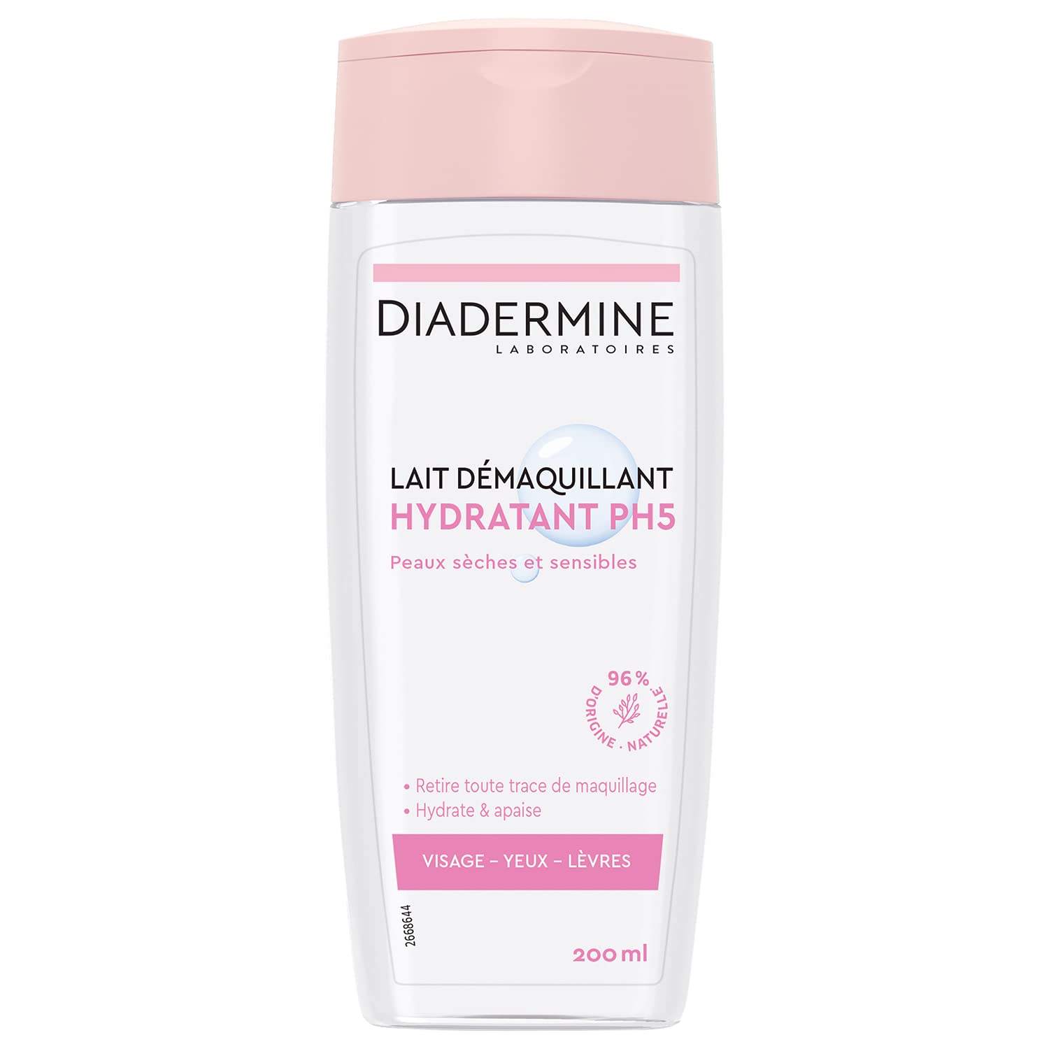 : Discover Diadermine's PH5 Moisturizing Cleansing Milk. Dry skin is particularly lacking in hydration and nourishment, making it more fragile and sensitive. It therefore needs intense hydration, nourishment, and protection. Ingredients: Aqua, paraffinum liquidum, triceteareth-4 phosphate, glycerin, ceteareth-12, cetearyl alcohol, sorbitol, taurine, panthenol, carbomer, tocopheryl acetate, parfum, hydroxypropyl methylcellulose, xanthan gum, calcium pantothenate, trisodium dicarboxymethyl alaninate, pantolactone, phenoxyethanol, methylparaben, propylparaben, CI 16035. P.when('A').execute(function(A) { A.on('a:expander:toggle_description:toggle:collapse', function(data) { window.scroll(0, data.expander. expander[0].offsetTop-100) }) }) Instructions for use 12 months after opening. See moreDiadermine Laboratories have demonstrated, through tolerance tests, the high compatibility of this product with even sensitive skin. Apply morning and evening with a cotton pad or fingertips, wipe dry, and then apply Diadermine's pH5 Soothing Toning Lotion. Skin is perfectly cleansed and intensely moisturized, supple, and comfortable. It provides hydration and nourishment, while simultaneously soothing and softening the skin. Diadermine's pH5 Moisturizing Cleansing Milk gently removes impurities and all traces of makeup, even waterproof.Description du produit Découvrez le lait démaquillant hydratant PH5 par Diadermine. Les peaux sèches manquent particulièrement d'hydratation et de nutrition, les rendant ainsi plus fragiles et plus sensibles. Il faut donc les hydrater intensément, les nourrir et les protéger. Ingrédients Aqua, paraffinum liquidum, triceteareth-4 phosphate, glycerin, ceteareth-12, cetearyl alcohol, sorbitol, taurine, panthenol, carbomer, tocopheryl acetate, parfum, hydroxypropyl methylcellulose, xanthan gum, calcium pantothénate, trisodium dicarboxymethyl alaninate, pantolactone, phenoxyethanol, methylparaben, propylparaben, Cl16035. P.when('A').execute(function(A) { A.on('a:expander:toggle_description:toggle:collapse', function(data) { window.scroll(0, data.expander. expander[0].offsetTop-100) }) }) Mode d'emploi 12 mois après ouverture. Voir plusLes Laboratoires diadermine ont démontré au moyen de tests de tolérance la haute compatibilité de ce soin avec la peau, même sensible. Appliquer matin et soir à l'aide d'un coton ou du bout des doigts, essuyez et appliquez ensuite la Lotion tonique apaisante pH5 de diadermine. La peau est parfaitement démaquillée et intensément hydratée, souple et confortable. Il apporte à la peau hydratation et nutrition, la peau est simultanément apaisée et adoucie. Le lait demaquillant hydratant ph5 de diadermine, enlève délicatement les impuretés et toutes traces de maquillage, même waterproof.Diadermine - Lait Démaquillant Visage, Yeux et Lèvres - Hydratant - PH5 - Peaux Sèches et Sensibles - Hydrate et Apaise - Nettoyant - 96 d'ingrédients d'origine naturelle - Flacon de 200 ml
