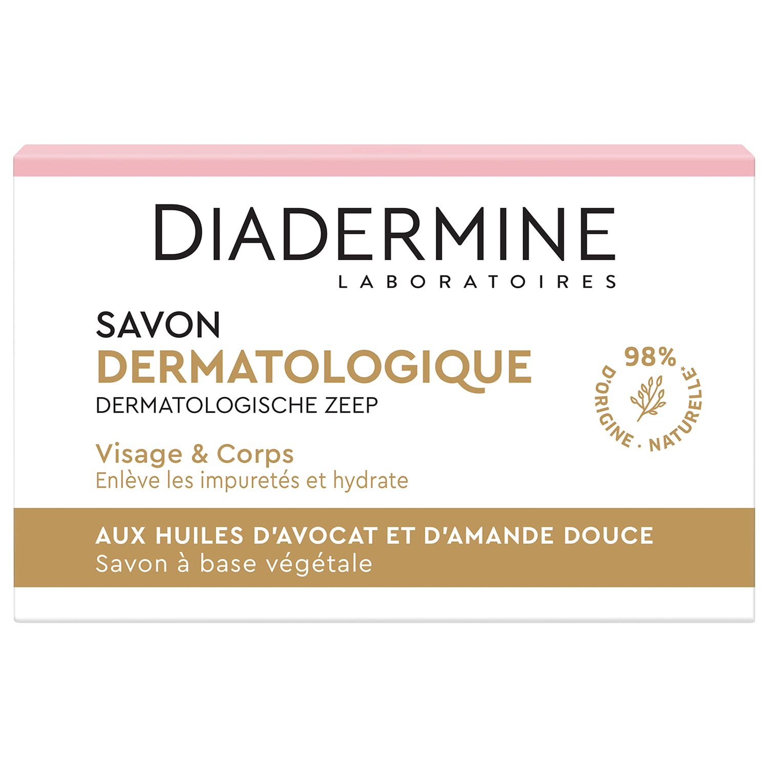 Diadermine - Savon dermatologique aux extraits hydratants d'amande douce et avocat - Visage et Corps - Nettoie et protège la peau du dessèchement - La boîte de 100g
