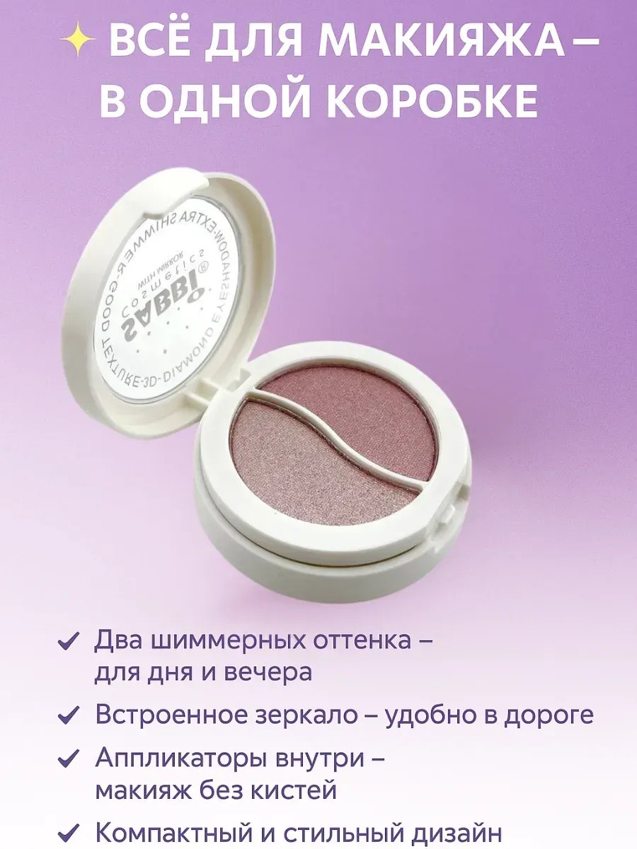 Шиммерные тени для век 2-в-1 в стильной компактной упаковке — это универсальное решение для создания как повседневного, так и вечернего макияжа глаз. Удобный формат, встроенное зеркало и два мини-аппликатора делают этот продукт идеальным спутником для поездок, офиса и сумочки на каждый день. Приятная текстура, сияющие оттенки и продуманная комплектация делают его одним из самых востребованных средств в категории «тени для век» на маркетплейсах.