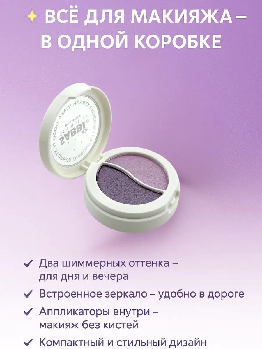 Компактные тени для век в формате дуо — это универсальный инструмент для создания как повседневного, так и вечернего макияжа. Два гармонично подобранных оттенка в сиренево-фиолетовой гамме подойдут как для дневного освежающего образа, так и для насыщенного вечернего взгляда. Эти тени с сияющим шиммером подчёркивают красоту глаз, делают взгляд ярче и визуально увеличивают глаза.
