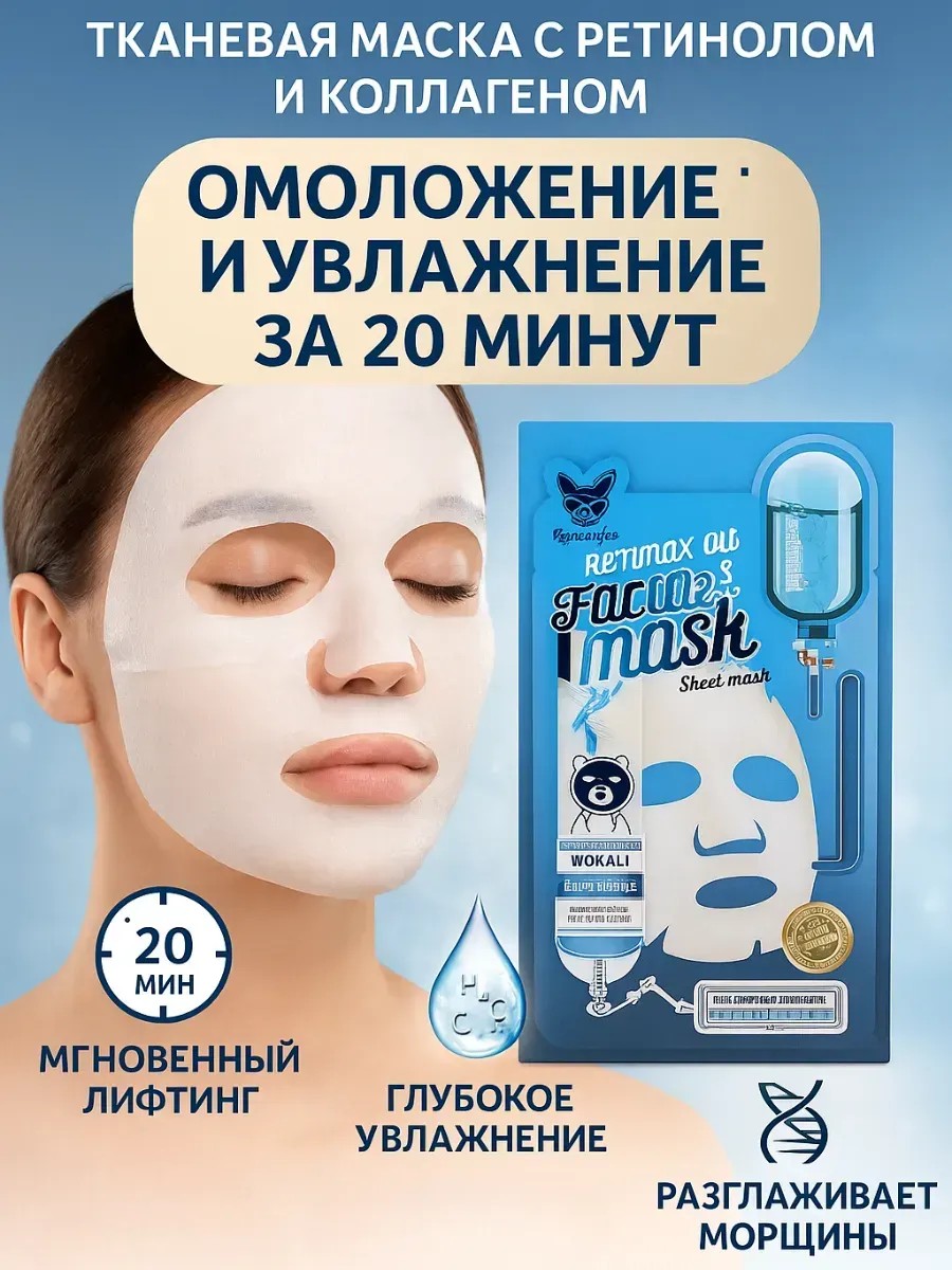 Тканевые маски для лица с ретинолом, коллагеном, гиалуроновой кислотой и витамином C — эффективное средство для омоложения и глубокого увлажнения кожи. В одной упаковке 10 масок, каждая из которых предназначена для полноценного ухода за сухой, возрастной и обезвоженной кожей.