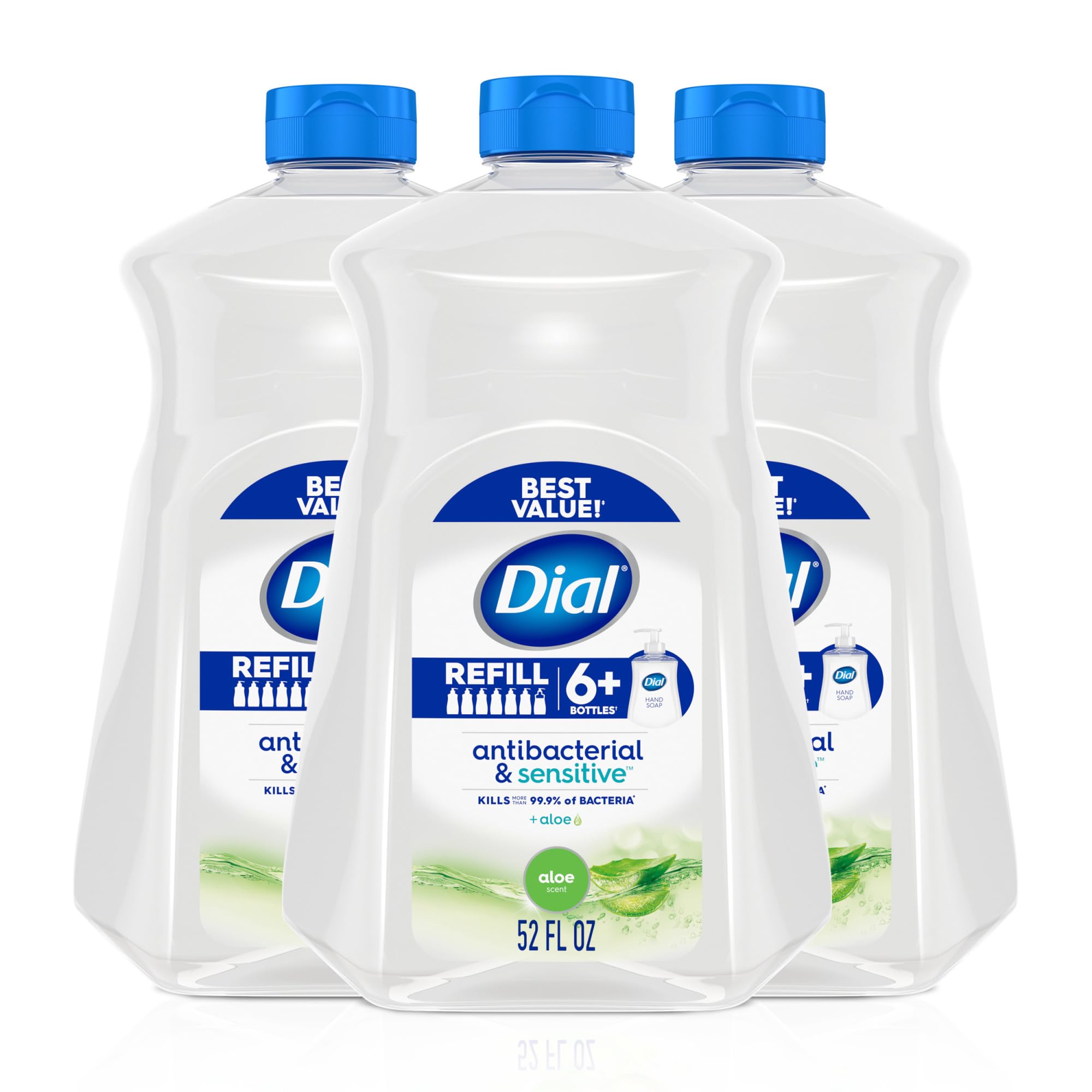 Dial Antibacterial Liquid Hand Soap Dial up your clean and enjoy the fresh scent of Dial Antibacterial Defense Aloe liquid hand soap. This pH-balanced, dermatologist-tested formula is tough on bacteria, yet gentle on skin. It kills more than 99.99 of bacteria encountered in household settings —including common kitchen bacteria while cleansing deeply and removing dirt, impurities residue. Made with moisturizers, aloe vera and gentle cleansers, it leaves skin feeling soft, smooth, and clean with every wash. Suitable for kitchens, bathrooms, or workplace sinks, it delivers a luxurious lather with each pump. Formulated without SLS SLES†, parabens, silicones, and phthalates, this vegan formula hand soap combines freshness with functionality. Packaged in a recyclable bottle (cap excluded). Choose from a range of delightful fragrances and know that you can trust this liquid soap to keep your hands clean. The 1 doctor-recommended antibacterial brand delivering clean confidence for generations. Dial is committed to providing formulas that care for skin without compromise—thoughtfully crafted, and approved as cruelty free under the Leaping Bunny program. Gentle, reliable cleansing for every hand in your home. Encountered in household settings. Escherichia coli, Salmonella, Listeria, Shigella and Camplyobacter Antibacterial hand soap brand †Sodium lauryl sulfate Sodium laureth sulfateLeaves Skin Feeling Clean: As one of the founding American personal cleansing brands, Dial became a household name in the 1940s. Today, Dial continues to innovate across body wash, bar and hand soap to help you, and your family, dial up your clean. User-Friendly for Every Sink: Whether at the kitchen sink, bathroom counter, or in shared spaces, Dial hand soap is great for high-traffic areas. One 52 fl oz liquid hand soap refill includes enough to refill 6 bottles of 7.5 fl oz Dial liquid hand soap. Vegan Hand Soap: Made without SLS SLES, parabens, phthalate silicones. Approved as cruelty free under the Leaping Bunny program. Bottle made with 100 recycled plastic (cap excluded) Sodium lauryl sulfate Sodium laureth sulfate. With Moisturizers: Dial formulas are created with conditioners gentle cleansers, giving you a balanced clean. Formulated with aloe vera, this liquid hand soap removes dirt and impurities and leaves skin feeling thoroughly clean and soft. Tough on Bacteria, Gentle on Skin: From the 1 Dr recommended brand, this liquid hand soap rinses clean without leaving a residue. Dermatologist-tested pH balanced, suitable for all skin types Antibacterial hand soap. Gentle Formula: Dial up your handwashing routine with this antibacterial liquid hand soap that kills more than 99.9 of bacteria and creates a luxurious lather. Cleanses deep while being gentle on skin. Encountered in household settings.