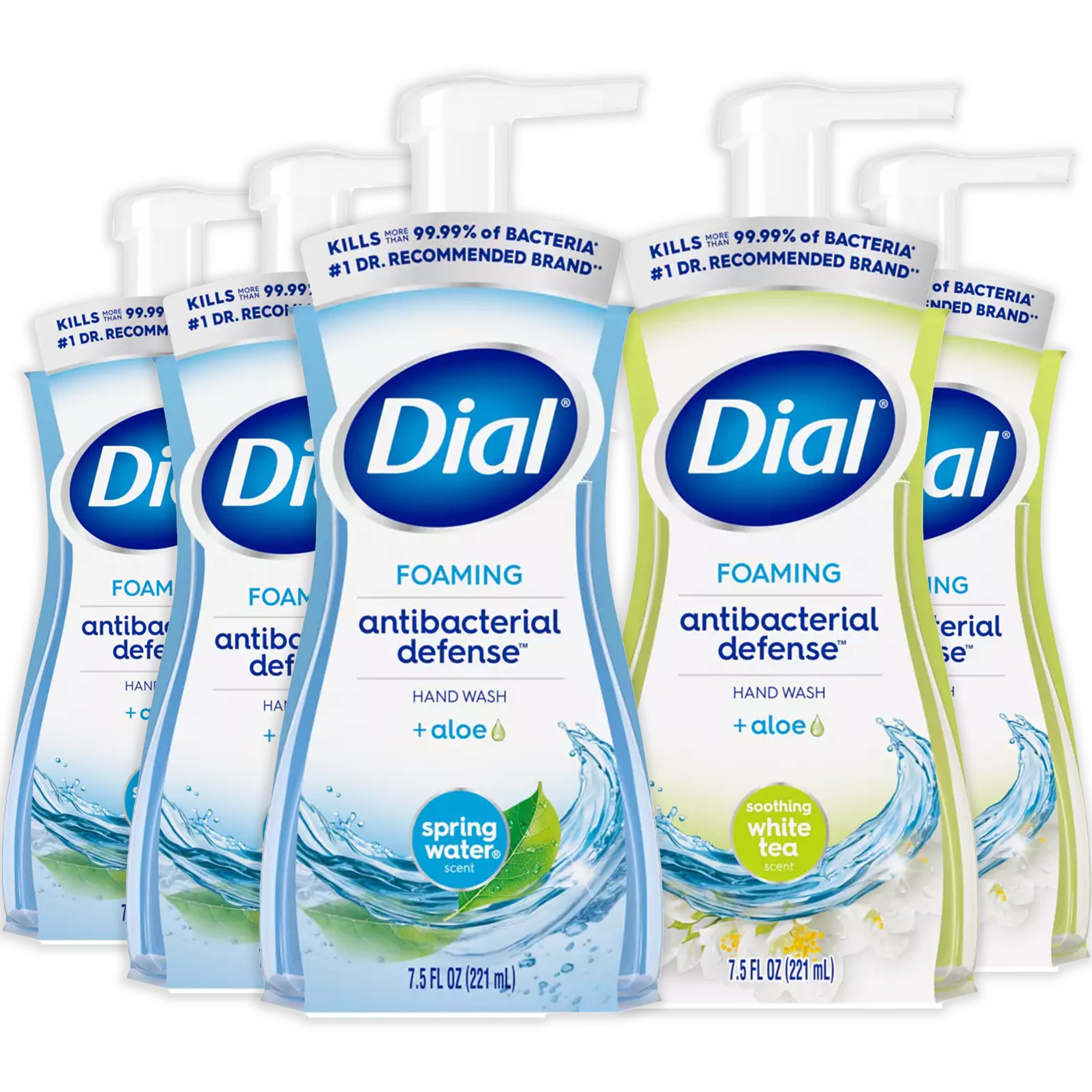 DIAL FOAMING HAND SOAP VARIETY PACK Enjoy a convenient 5-pack set that includes two bottles of White Tea scent and three bottles of Spring Water scent. Each bottle holds 10 oz of foaming hand soap, giving you a total of 50 oz to keep every sink in your home stocked and ready. Rich Foaming Lather Turn daily handwashing into a refreshing routine with a smooth, airy foam that spreads easily across your hands. The lightweight texture rinses off quickly without leaving residue, making it a simple and enjoyable way to keep your hands clean throughout the day. Gentle On Hands Formulated to care for your skin, this foaming soap helps wash away dirt while keeping your hands soft and hydrated. The White Tea and Spring Water scents provide a fresh, soothing experience that makes frequent washing feel less like a chore and more like a moment of self-care. Easy-To-Use Design Each 10 oz pump bottle is designed to dispense the right amount of foam with every press, helping reduce waste and making it perfect for busy households, offices, kitchens, and bathrooms. Its compact shape fits neatly on counters without taking up too much space. Everyday Reliability This 5-pack variety set is a great way to stay prepared with plenty of soap for the whole family. Whether placed by the bathroom sink, kitchen counter, or office washroom, it's a dependable choice for daily hand care that combines value, freshness, and convenience.TRUSTED BRAND FOR EVERYDAY HANDWASHING: Dial has been a household favorite for decades, offering reliable hand care in convenient packaging. This foaming soap set combines value, freshness, and quality for daily hygiene needs. EASY-TO-USE PUMP DISPENSER: Each 10 oz pump bottle delivers the right amount of foam in every press, reducing waste and lasting longer than liquid soap refills. Compact size fits well on bathroom countertops and kitchen sinks. QUICK-RINSING MOISTURIZING: The smooth foam rinses off easily without residue, helping to maintain soft, hydrated skin. White Tea and Spring Water scents provide a refreshing experience, making handwashing enjoyable for the whole family. GENTLE FOAMING FORMULA: Dial Foaming Hand Soap creates a rich, airy lather that washes away dirt while leaving hands feeling clean and soft. Designed for daily handwashing at home, office, or school with a light, pleasant scent. 5-PACK VARIETY SET: Comes with (2) White Tea Foaming Hand Soap bottles and (3) Spring Water Foaming Hand Soap bottles. Each pump bottle contains 10 oz, giving you a total of 50 oz of liquid foaming soap for everyday use.