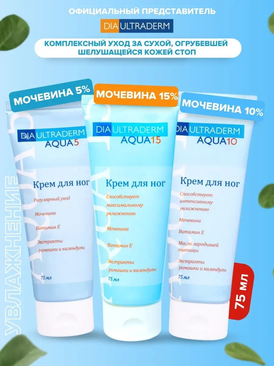 Набор Diaultraderm. Крем для ног с мочевиной Aqua 15, туба 75 мл., крем для ног Аква 10, крем для ног Аква 5, туба 75 мл. на фото.