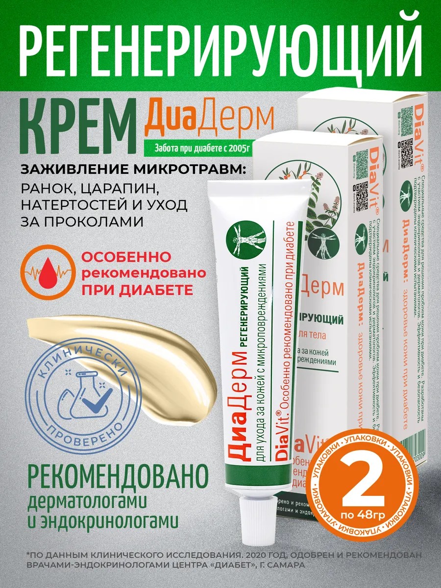 DiaDerm Regenerating Cream accelerates skin regeneration in areas of microdamage: scratches, cuts, abrasions, insulin injection sites, and finger pricks after blood sampling with a glucometer.