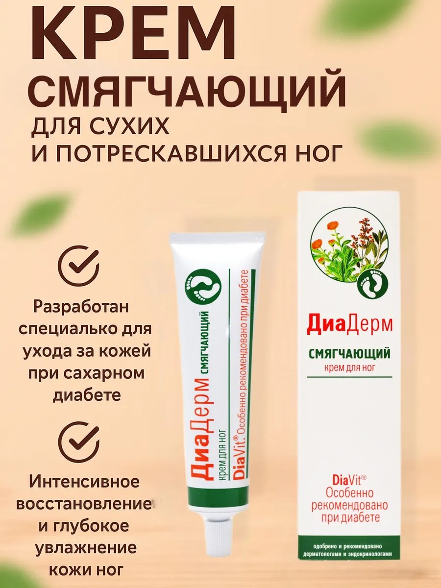 Крем ДиаДерм Смягчающий эффективно питает, увлажняет и смягчает кожу, уменьшает избыточное ороговение, мозоли и трещины. Богатый комплекс натуральных ингредиентов нормализует обменные процессы кожи, обеспечивая полноценное питание клеток. Разработан специально для ухода кожей при сахарном диабете, но является эффективнм продуктом и для людей со схожими проблемами с кожей.