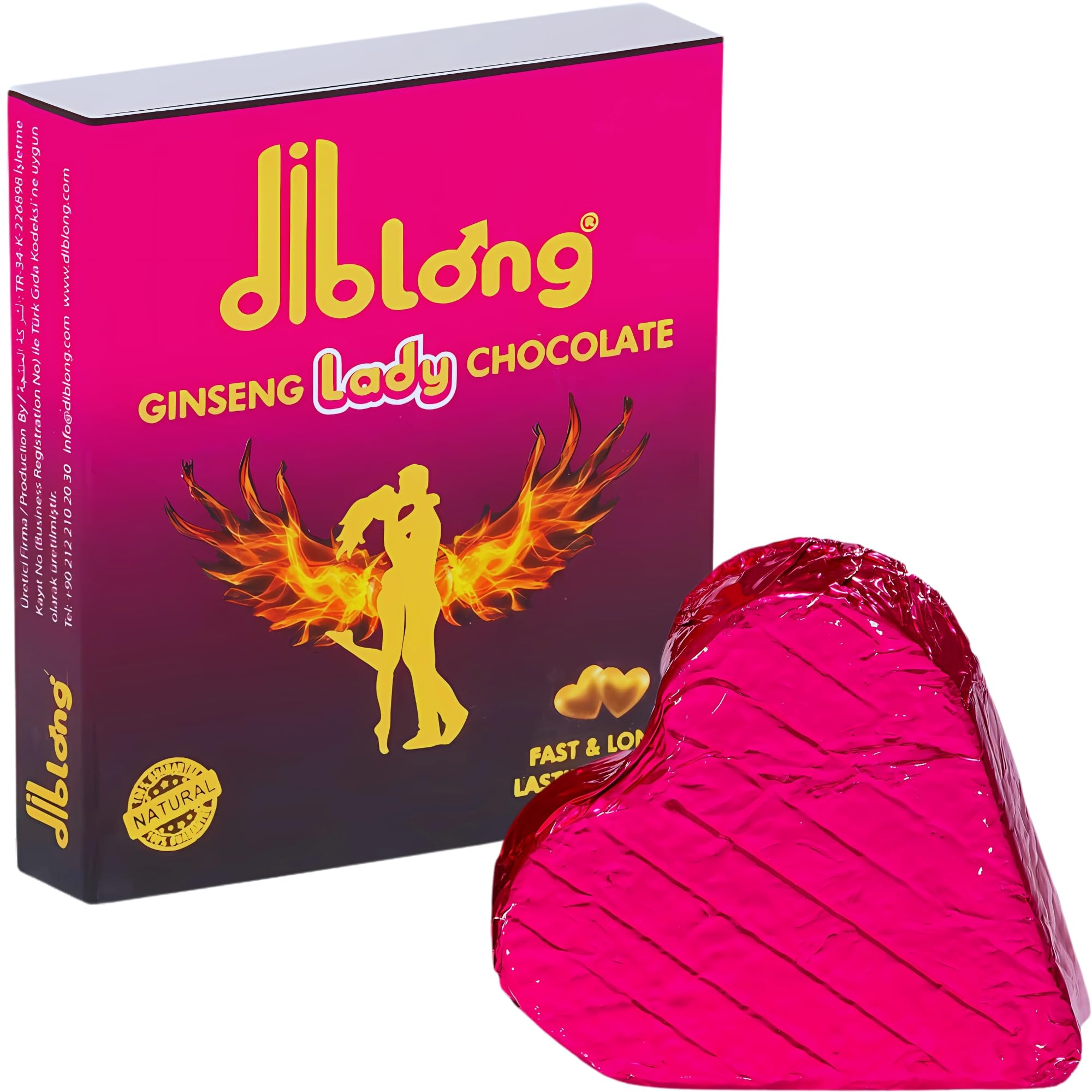 Discover indulgence with purpose with Diblong Lady Energy Chocolate for Women (16g) – a premium dark chocolate made from high-quality cocoa and enriched with carefully selected spice ingredients. Designed for women who appreciate both taste and vitality, this chocolate offers the perfect balance of pleasure and energizing support. Each serving is made with 30 cocoa powder and 9.05 cocoa butter, combined with hazelnuts, sesame seeds, soy lecithin, whey powder, and natural vanilla for a smooth and satisfying taste. In addition, Diblong Lady Chocolate contains ginseng extract (1 ) and ginger (0.8 ), ingredients traditionally valued for their invigorating and revitalizing effects. These natural elements support physical endurance, refresh the body, and promote everyday well-being. Chocolate naturally contains ginsenosides from ginseng and caffeine from cocoa, which contribute to alertness and energy metabolism. Thanks to its convenient 16g heart-shaped size, this bar is designed for a single serving, ideal for on-the-go enjoyment whenever you need a delicious treat with an energy boost. Made in Turkey, Diblong Lady Chocolate reflects a strong combination of tradition and innovation. Each bar is carefully crafted, with meticulous attention to quality and taste, so women can enjoy a product that combines the art of chocolate with the functional benefits of plant-based ingredients. Completely alcohol-free and made with plant-based ingredients, it's a responsible choice for those seeking a delicious treat with added value. Whether it's a daily ritual, a tasty break in between, or a pre-workout boost, Diblong Lady Energy Chocolate offers a unique way to enjoy chocolate with added vitality. Surprise your moments with the rich taste of cocoa and the invigorating notes of ginseng and ginger, designed to naturally support your energy and well-being. INGREDIENTS Sugar (sweetener), cocoa powder 30 , cocoa butter 9.05 , hazelnut (fruit) 2.10 , ginseng extract 1 , Susan pea seeds 1 , ginger 0.8 , soy lecithin (emulsifier), whey powder (milk) 0.01 , vanilla flavor.Tradition meets innovation – Made in Turkey with carefully selected ingredients, Diblong Lady Chocolate combines the art of premium chocolate with a modern spice blend. Compact and convenient: each 16g heart-shaped bar is designed as a single serving, easy to carry and enjoy anytime, perfectly combining taste and energy. Balanced wellness support – Naturally contains ginsenosides from ginseng and caffeine from cocoa, which contribute to alertness, stamina, and daily vitality. Spiced herbal blend for vitality – Enriched with ginseng extract (1 ), ginger (0.8 ), hazelnuts, sesame seeds, and natural vanilla, ingredients traditionally known for their stimulating and nourishing properties. Premium dark chocolate – Diblong Lady Energy Chocolate for women (16g), made with 30 cocoa powder and 9.05 cocoa butter for a rich, full-bodied chocolate taste.Diblong Aphrodisiaque Lady Energy Chocolate pour Femme (16g) – Chocolat Noir Premium au Ginseng, Gingembre, Noisette Mélange de Plantes épicées – Soin Naturel pour Vitalité Bien-êtreDESCRIPTION DU PRODUIT DESCRIPTION DU PRODUIT Découvrez l'indulgence avec un but grâce au chocolat énergétique Diblong Lady pour femme (16g) – un chocolat noir haut de gamme, fabriqué à partir de cacao de qualité supérieure et enrichi d'ingrédients d'épices soigneusement sélectionnés. Conçu pour les femmes qui apprécient à la fois le goût et la vitalité, ce chocolat offre un équilibre parfait entre plaisir et soutien énergisant. Chaque portion est fabriquée avec 30 de poudre de cacao et 9,05 de beurre de cacao, combiné avec des noisettes, des graines de sésame, de la lécithine de soja, de la poudre de lactosérum et de la vanille naturelle pour un goût doux et satisfaisant. De plus, Diblong Lady Chocolate contient de l'extrait de ginseng (1 ) et du gingembre (0,8 ), des ingrédients traditionnellement appréciés pour leur effet revigorant et revitalisant. Ces éléments naturels soutiennent l'endurance physique, rafraîchissent le corps et favorisent le bien-être quotidien. Le chocolat contient naturellement des ginsénosides de ginseng et de la caféine du cacao, ce qui contribue à la vigilance et au métabolisme énergétique. Grâce à sa taille pratique en forme de cœur de 16 g, cette barre est conçue pour une portion d'une personne, idéale à emporter et à déguster lorsque vous avez besoin d'un moment de gourmandise savoureuse avec une poussée d'énergie. Fabriqué en Turquie, Diblong Lady Chocolate reflète une forte combinaison de tradition et d'innovation. Chaque barre est préparée avec soin, en accordant une attention particulière à la qualité et au goût, afin que les femmes puissent profiter d'un produit qui combine l'art du chocolat avec des avantages fonctionnels à base de plantes. Entièrement sans alcool et fabriqué avec des ingrédients végétaux, c'est un choix responsable pour ceux qui recherchent une délicieuse friandise à valeur ajoutée. Qu'il s'agisse d'un rituel quotidien, d'une pause savoureuse entre les deux ou d'un moment avant les activités, Diblong Lady Energy Chocolate offre une façon unique de déguster du chocolat avec plus de vitalité. Surprenez vos moments avec le goût riche du cacao et la note stimulante du ginseng et du gingembre, conçus pour soutenir votre énergie et votre bien-être de manière naturelle. INGRÉDIENTS Sucre (sweetener), poudre de cacao 30 , beurre de cacao 9.05 , noisette (fruit) 2.10 , extrait de ginseng 1 , graines de Susan 1 , gingembre 0.8 , lécithine de soja (émulsifier), poudre de lactosérum (lait) 0.01 , vanille flavor.La tradition rencontre l'innovation - Fabriqué en Turquie avec des ingrédients soigneusement sélectionnés, Diblong Lady Chocolate combine l'art du chocolat de qualité supérieure avec un mélange d'épices moderne. Compact et pratique : chaque barre en forme de cœur de 16 g est