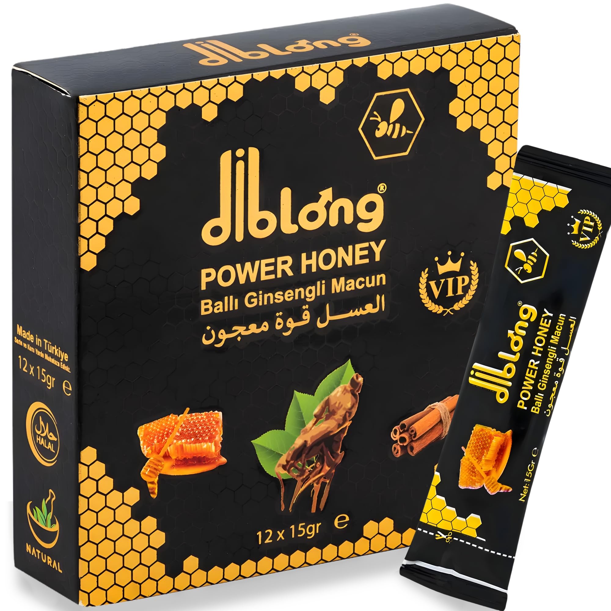 Quality Ingredients – Contains bee products and oats (gluten). Consult a healthcare professional if you have allergies or specific medical conditions. Pack of 12 Sachets – Contains 12 sachets of 15g each (12 cm x 3.5 cm x 1 cm), easy to carry and consume at any time of day. Authentic Formula – Each sachet contains a natural blend of quality ingredients, individually wrapped for freshness and convenience. Natural Composition – Prepared with wildflower honey, maca, ginseng, pollen, royal jelly, ginger, and cloves, in ready-to-eat portions. Honey Blend for Men – Diblong Power Honey for Men, made in Turkey, comes in convenient single-dose sachets with a natural blend of honey and selected botanical ingredients.Ingrédients de Qualité – Contient des produits de la ruche et de l'avoine (gluten). Il est conseillé de consulter un professionnel de santé en cas d'allergies ou de conditions particulières. Pack de 12 Sachets – Contient 12 sachets de 15g chacun (12 cm x 3,5 cm x 1 cm), faciles à emporter et à consommer à tout moment de la journée. Formule Authentique – Chaque sachet contient un mélange naturel d'ingrédients de qualité, emballé individuellement pour préserver la fraîcheur et la praticité. Composition Naturelle – Préparé avec du miel mille-fleurs, maca, ginseng, pollen, gelée royale, gingembre et clou de girofle, en portions prêtes à consommer. Mélange de Miel pour Hommes – Diblong Power Honey for Men, fabriqué en Turquie, présenté en sachets monodoses pratiques avec un mélange naturel de miel et d'ingrédients botaniques sélectionnés.Diblong Miel Aphrodisiaque Homme (Pack de 12 Sachets de 15g) – Mélange Naturel aux Herbes pour le Bien-Être – Fabriqué en Turquie