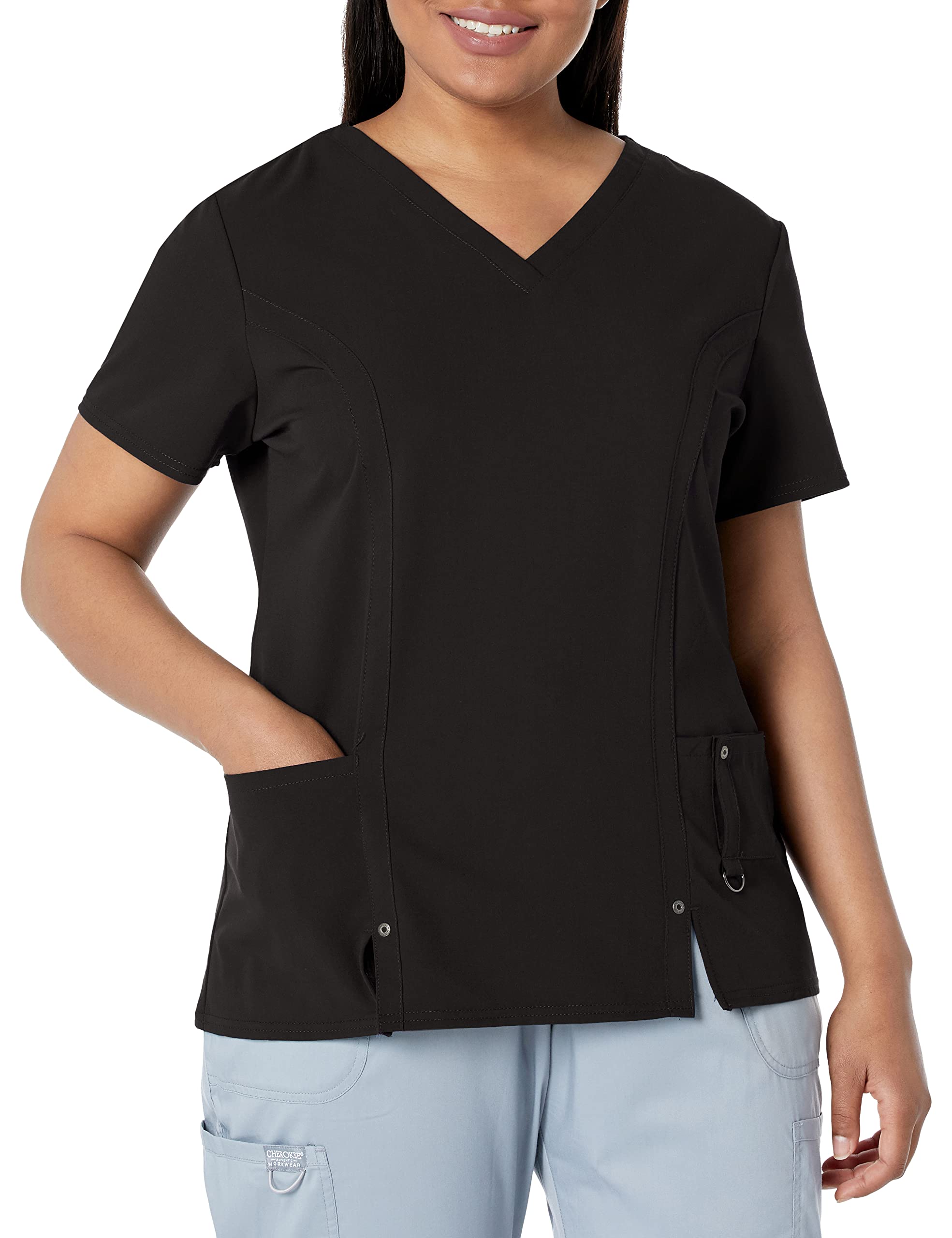 Logo tag at sleeve. Two front pockets. Fitted short-sleeve shirt featuring V-neckline with two front vents and decorative grommets at hem. Machine Wash. Pull On closure. Imported. 75% Polyester, 21% Rayon, 4% Spandex.