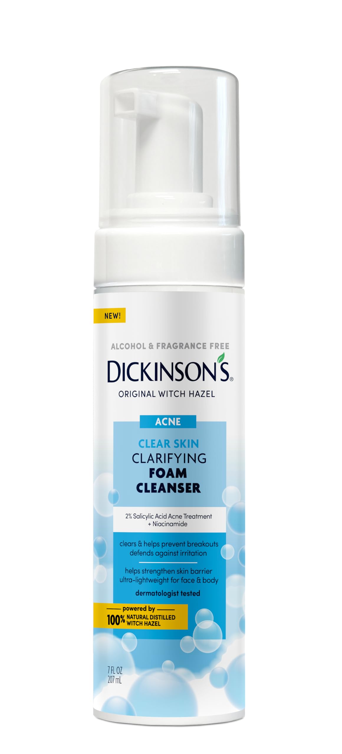 CLEAN RINSE, NO RESIDUE: Lightweight foam cleanser rinses completely clean without clogging pores or irritating skin. For best use, dispense two pumps onto fingertips and massage on to damp skin. Spread in small circular motion. Then rinse. Use AM and PM. If bothersome drying or peeling occurs, reduce usage to every other day. After acne clears, continue using for preventative care. If desired, follow cleansing with Clear Skin Exfoliating Toner (sold separately). FRAGRANCE FREE ALCOHOL FREE: Designed for all skin types, especially sensitive or acne-prone skin. No harsh additives. This facial cleanser is effective and gentle enough for daily use!. STRENGTHENS SKIN BARRIER: Niacinamide helps remove excess oil while supporting a healthy, balanced complexion. POWERFUL YET GENTLE FORMULA: Pure distilled Witch Hazel and Tea Tree Extract to soothe and calm skin without overdrying. Unlike some watered-down products from other brands, we distill our witch hazel to meet the highest standards of purity and efficacy, according to USP. FIGHTS ACNE WITH 2 SALICYLIC ACID: Dickinson's Witch Hazel Acne Foam Cleanser helps clear existing breakouts and prevent new ones from forming, targeting acne at the source. This unique daily acne solution is appropriate for all skin types and can be used by both men and women, teens and adults alike.