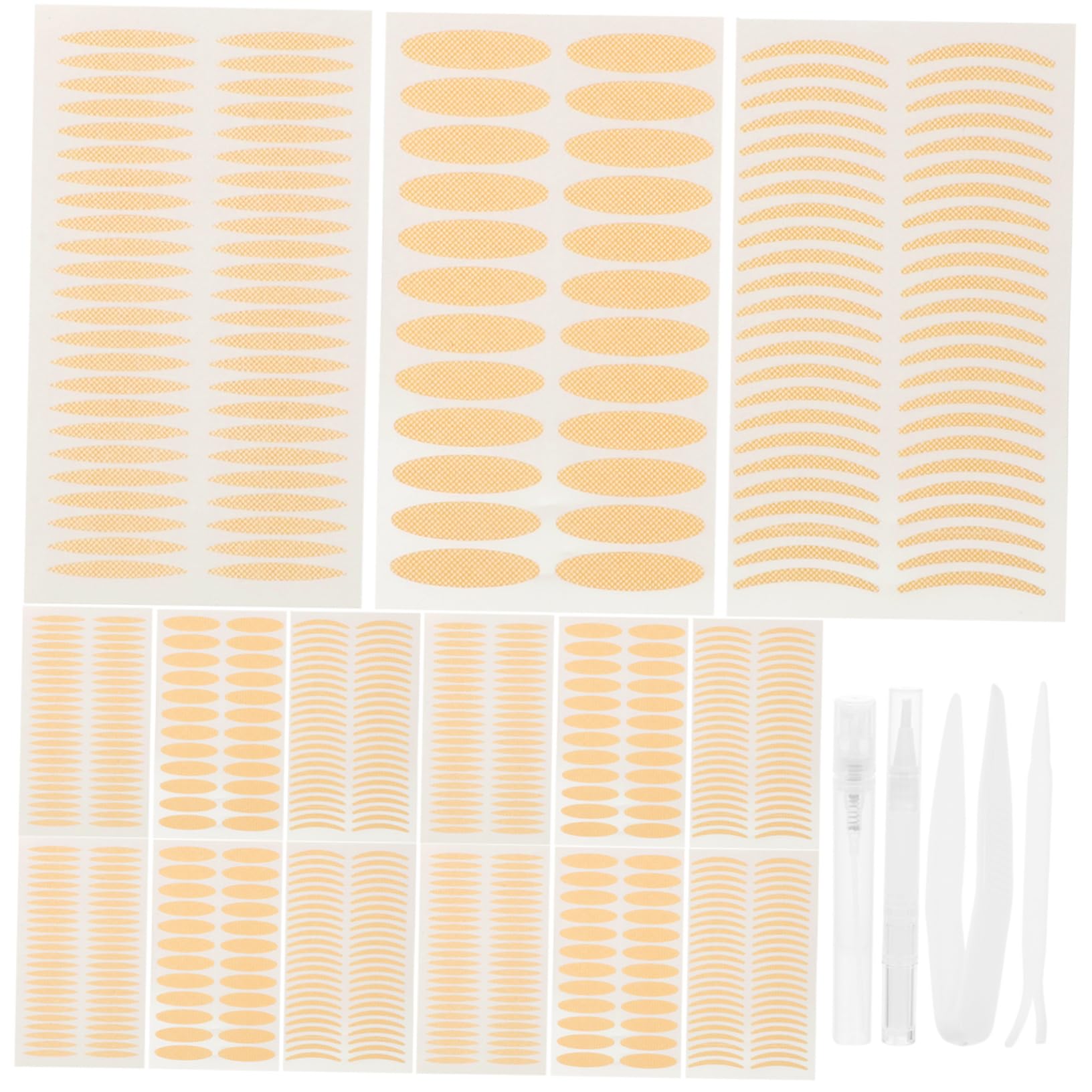 Package List 12 x Sheets of Double Eyelid Stickers 1 x Y-Clip 1 x Small clip 1 x Spray bottle 1 x Styling cream Characteristics -Color:As Shown girl double eyelid tape -Size(Styling Cream):12.60X1.10X1.10cm/4.95X0.43X0 girls eyelid tapes. -Size(Double Eyelid Sticker):10.00X5.50X0.10cm/3.93X2.16X0 eyelid tapes for makeup. -Size(Spray bottle):10.00X1.20X1.20cm/3.93X0.47X0 eyelid stickers. -Material:Mesh,
