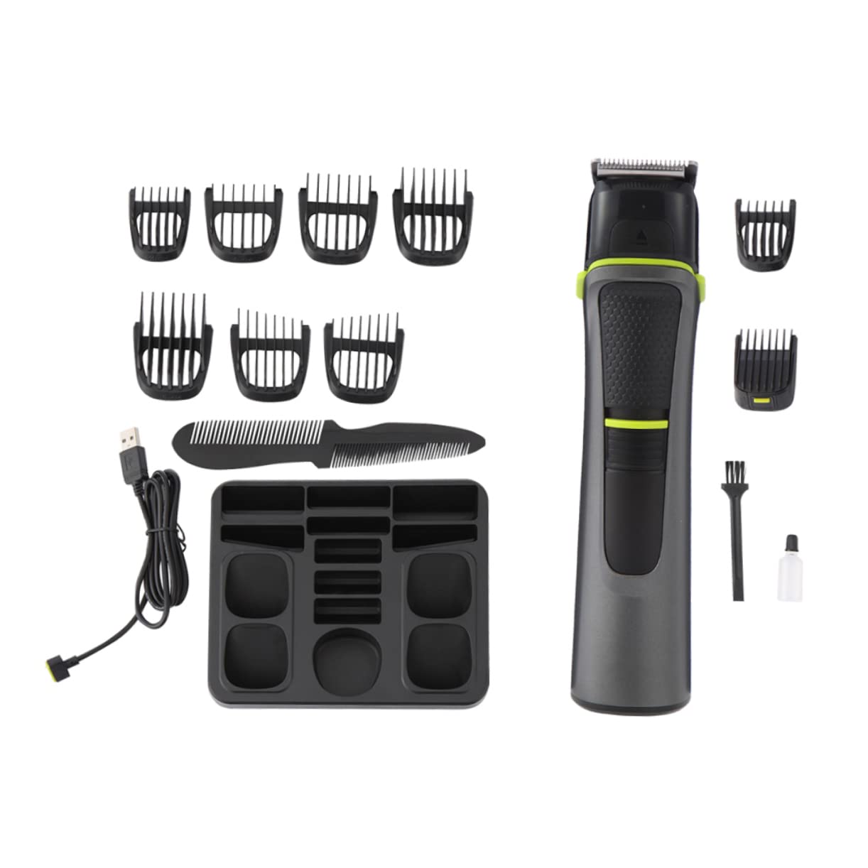 Package Include 1 x trimmer 1 x comb 1 x lubricant oil 1 x charging cable 1 x cleaning brush 1 x manual 4 x replacement heads 9 x combs Characteristics - Color: Assorted Electric Beard Trimmer. - Charging Time: 2 Hours Barber Supplies. - Size: About 16.80X3.80X3.00cm/6.60X1.49X1.18inch Salon Hair Clipper. - Usage Time: 60 Minutes Electric Haircut Kit. - Material: Steel Rechargeable Hair Trimmers. - This hair clipper for men provides superior cutting for all hair types and length Hair Cutting Kit. - Low noise, will not jam the hair, and will not harm/irritate the skin Clipper. - For touch ups between hair clipping and detail shaving, mustaches, sideburns, goatees, stubble, nose, ear, other face and body hair! Electric Barber Clippers - Ergonomic slim body design makes it very easy to handle, for travel or business trip Household Hair Clipper. - The are long lasting for quiet performance for outstanding performance in a hair and beard trimmer Hair Trimmer. Goods Description mustache clippers Hair clipper set for men provide a smoothly precise trim, so you can get the hair style you want.Hair Clippers The of the hair clipper are engineered for long lasting sharpness.Hair Cutting Kit Gives you the precision you need to get the style you want.men hair trimmer Choose from a variety of guide comb lengths and widths for any hair styles.mens hair trimmer Precision ground easily cut through even the thickest hair, eliminating pulling and snagging