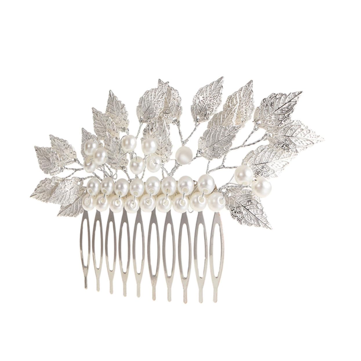 Package Include 1 x headdress Features -Size: 12.00X8.00X1.00cm/4.72X3.14X0 Bride Comb. -Color: Silver Chic Hair Comb Pin -Material: Zinc alloy Bridal Hairpin Comb -You will be happy on wedding day and can keep this forever with stay this headdress as a souvenir Bridal Hair Comb Clip. -This hair comb barrette can firmly hold and decor your bun head or French twists up do Bride Side Comb. -Combine with pearl and small silver leaves, will bring you the best visual effects and will complete the beauty of you Pearl Deisgn Hair Comb Clip. -Wedding is a memorable moment for every woman, choose this for bride or bridesmaid Hair Comb for Bride. -Creative and vintage design, complete the beauty of this hair clip comb, can be worn on side or back as you like Side Hair Combs. Goods Description Pearl Hair Clip Comb Made of premium material and having the delicate appearance, for bridal haircut decoration.Bride Headdress Hair comb clip design, will hold your hairstyle effortlessly.Zinc Alloy Comb Are you still thinking of any possible way to highlight your beauty and taste? Then do not miss this elegant bride headdress