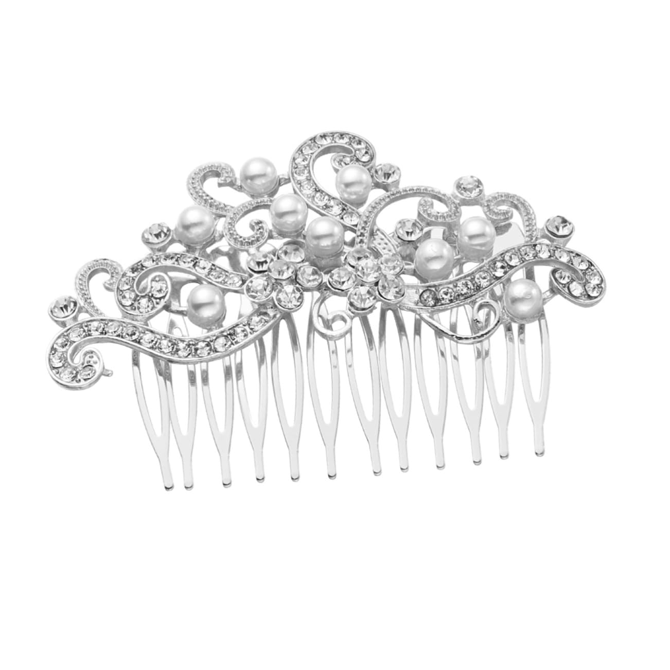 Package List 1 x Bride Hair Comb Characteristics - Material: Pearl + Rhinestone + Alloy bridal headpiece. - Color: Silver metal hair barrettes. - Size: About 8.5x6x1cm wedding pearl hair comb. - Made of material with great workmanship headwear for women. - Chic and elegant design with gorgeous color and brightness metal hair clips. - The exquisite structure and craft make it looks unique and distinctive women hair side comb. bridal hair accessories - Suitable for any women on your wedding, special party or prom wedding veil. - for your female friends, they will like it bridal hair clip. Goods Description pearl side headpiece The elegant and gorgeous design of this headdress will ensure its practicability and popularity among headpieces decoration.hair combs for women This product is an elegant headdress for bride.women hair accessories The exquisite structure and craft make it looks unique and distinctive